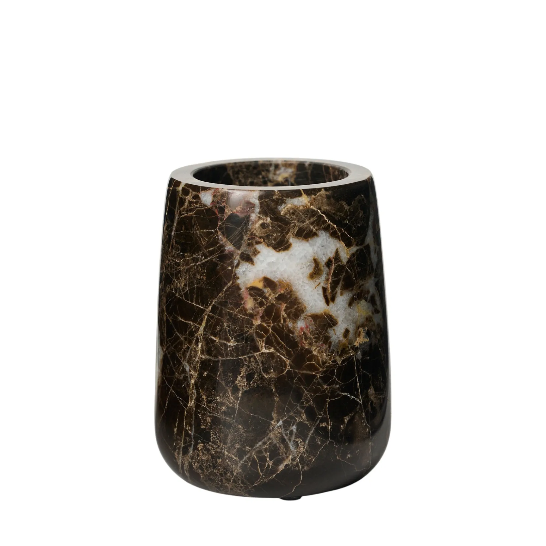 Tandbørstekrus i marmor, i varme brune nuancer og en blank overflade.