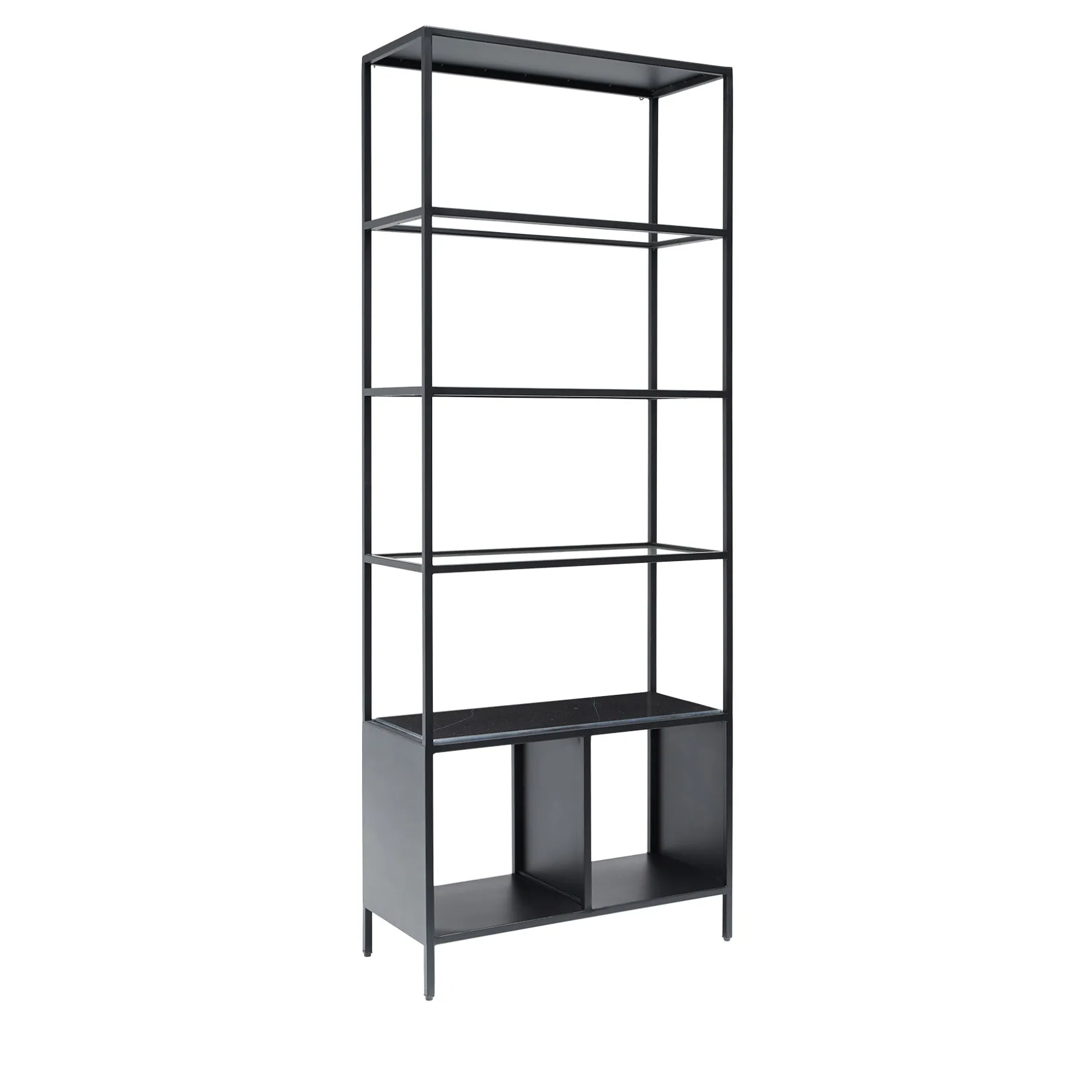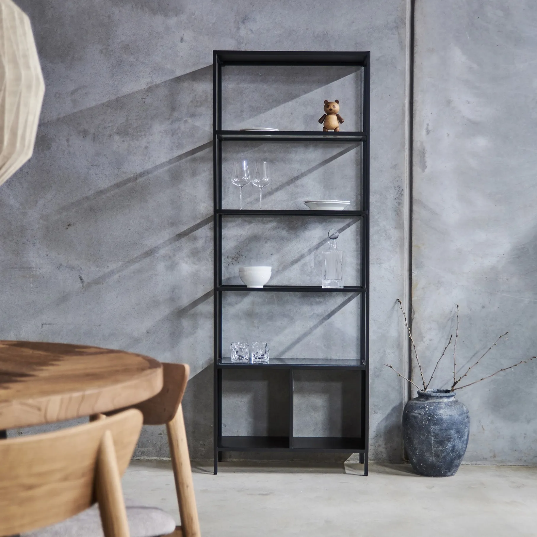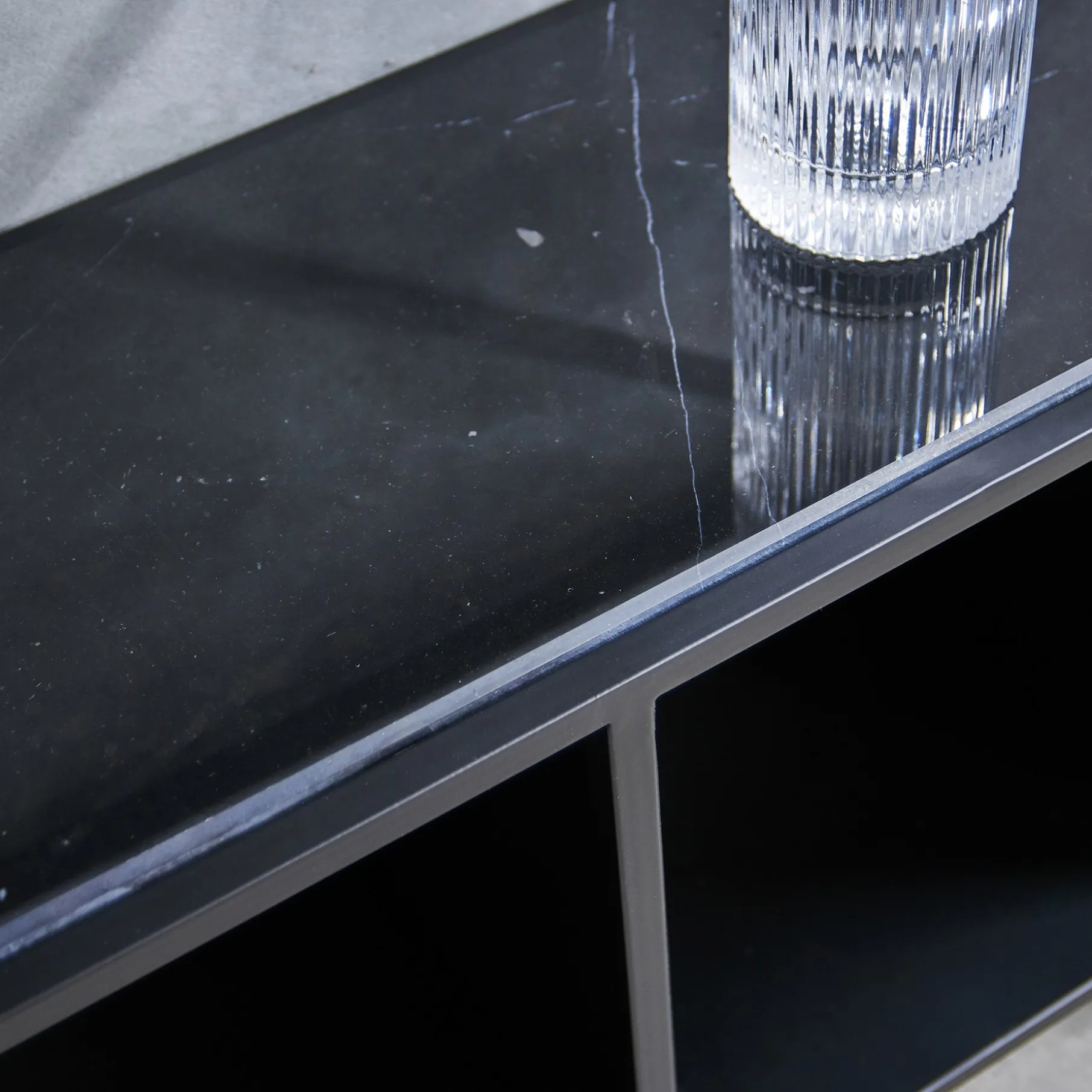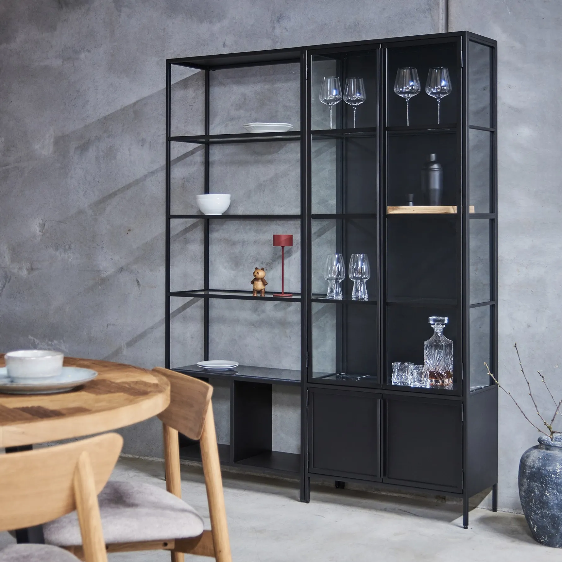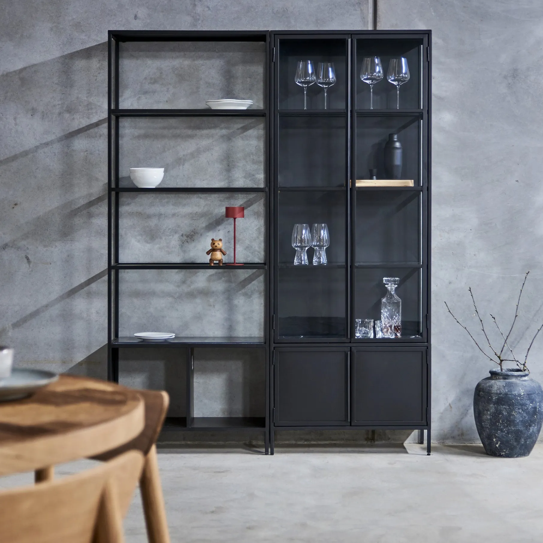 De rå, pulverlakkerede metaloverflader møder udskifteligt marmor i en sofistikeret kontrast og giver skabet en skarp karakter – industriel og raffineret på én og samme tid. Det åbne design lader lyset vandre frit og giver dit interiør plads til at ånde og træde frem. Nederst skaber de åbne rum en praktisk opbevaring, hvor dine ting får plads til at stå frit og tilgængeligt – uden at fylde for meget i rummet.