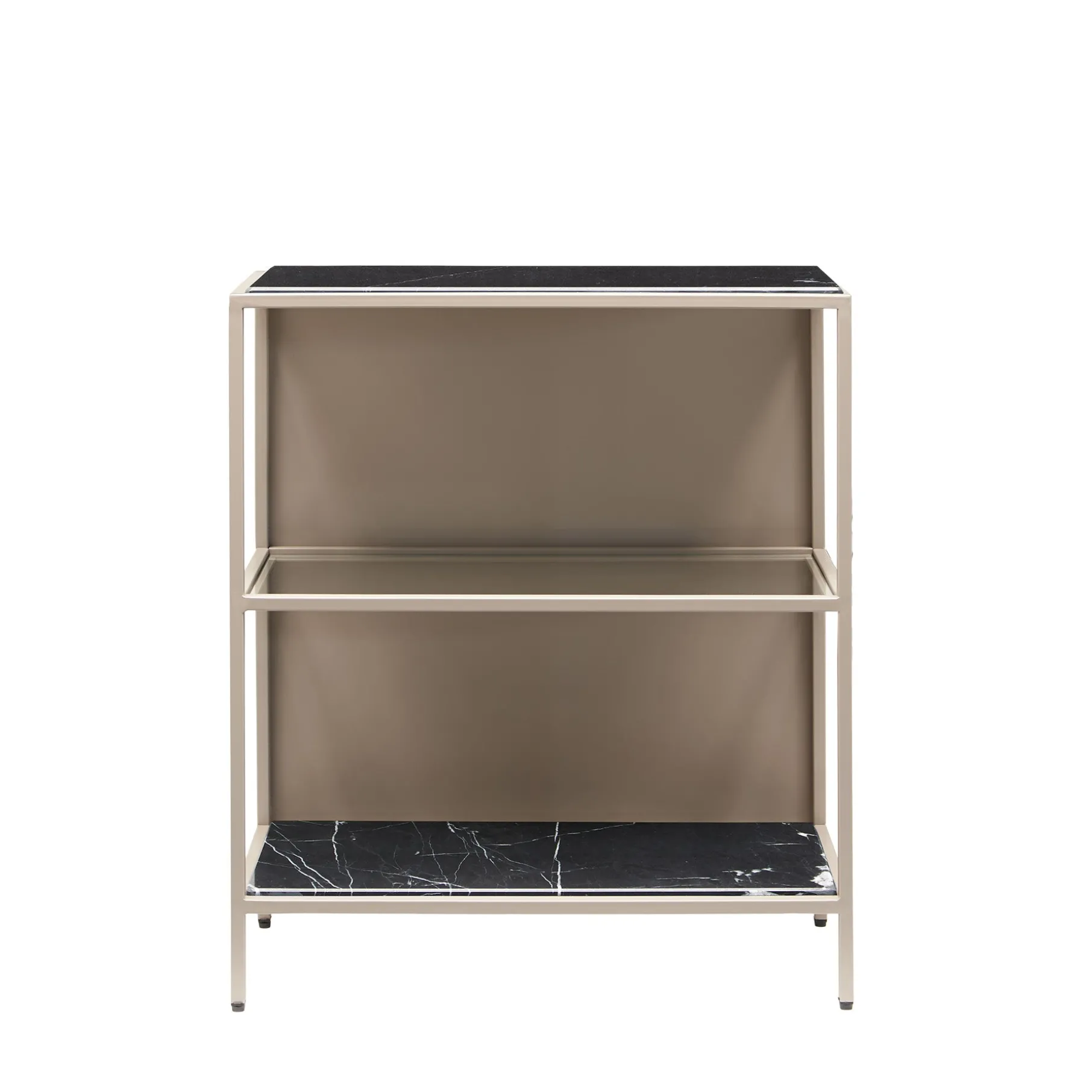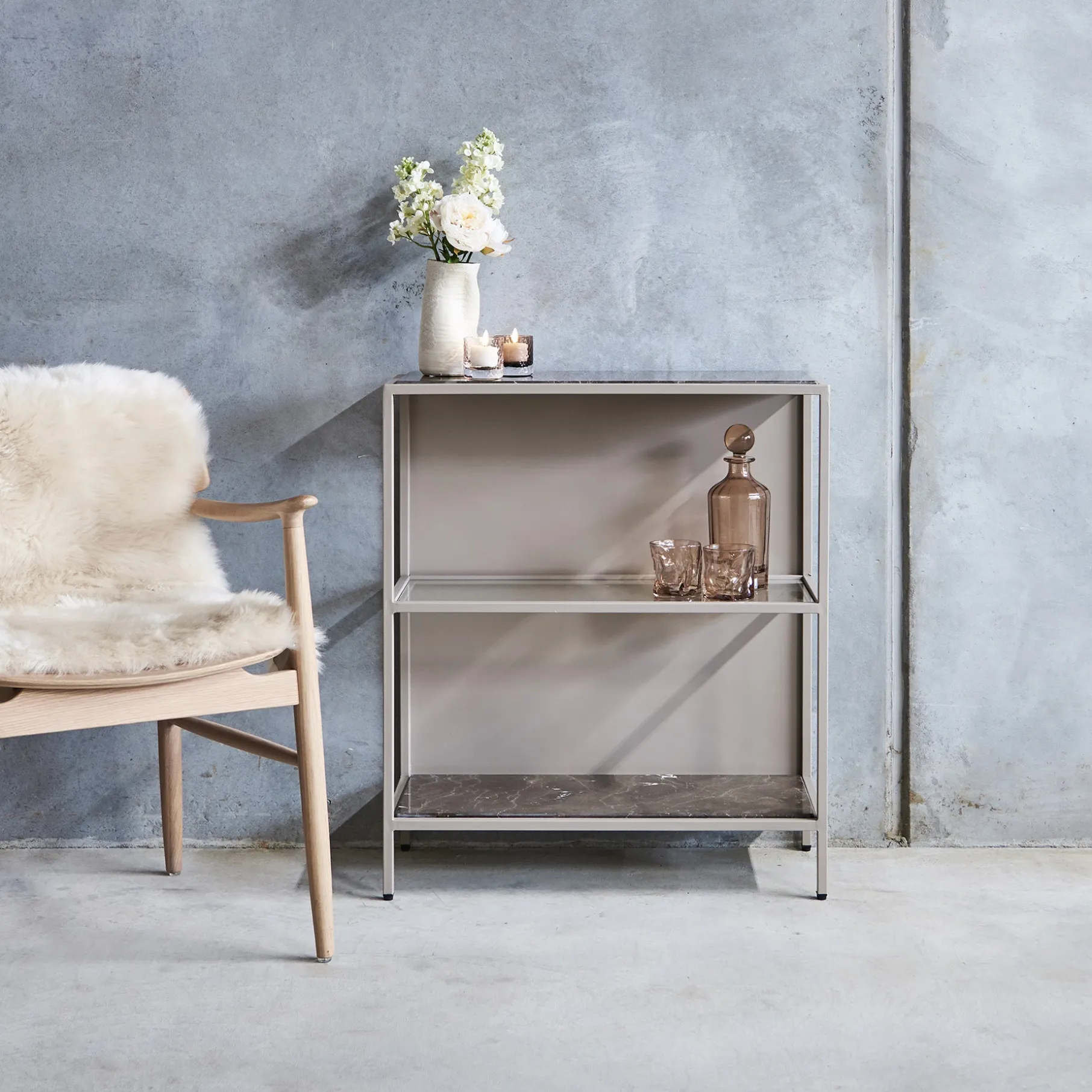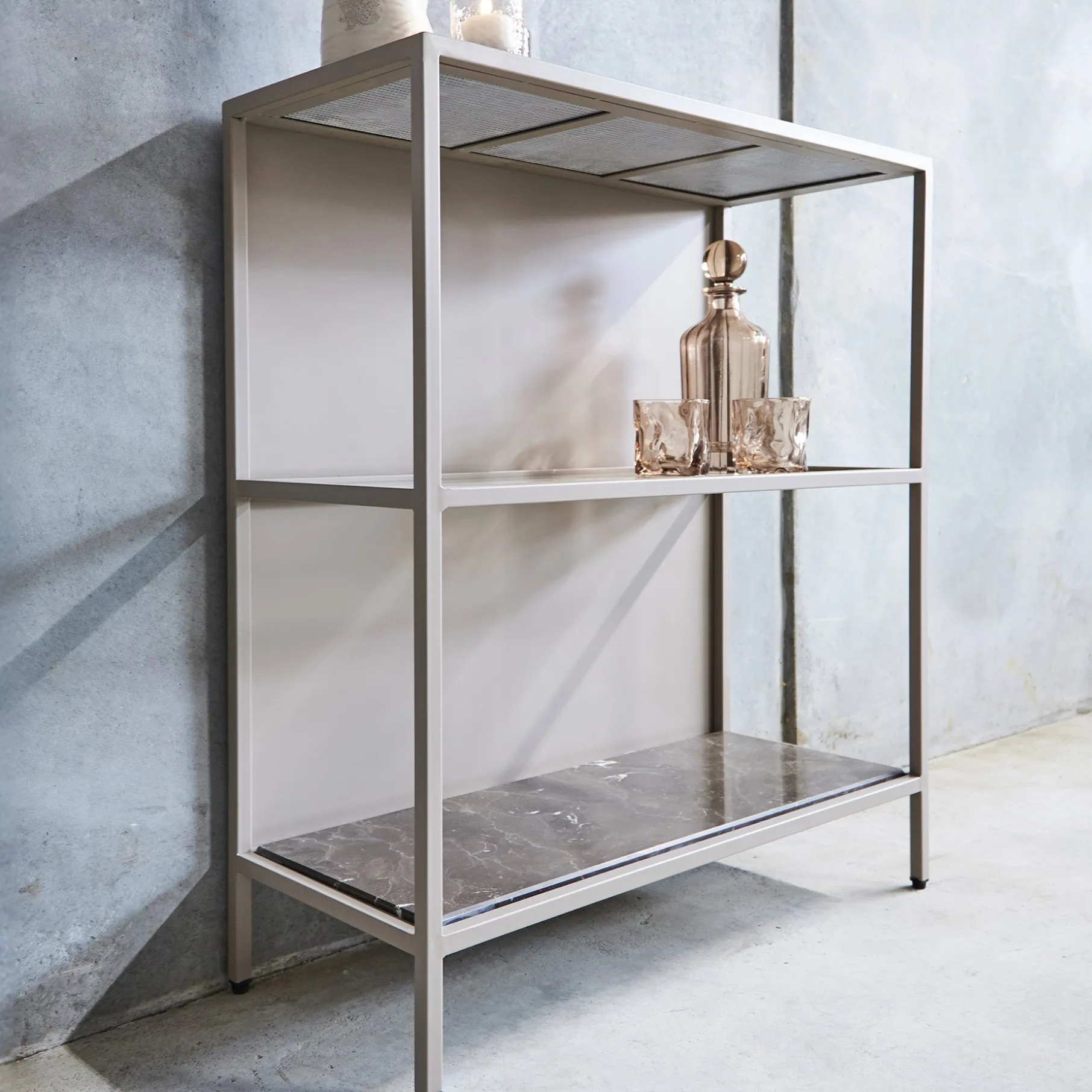 De rå, pulverlakkerede metaloverflader møder udskifteligt marmor i en sofistikeret kontrast og giver skabet en skarp karakter – industriel og raffineret på én og samme tid. Det åbne design lader lyset vandre frit og giver dit interiør plads til at ånde og træde frem.