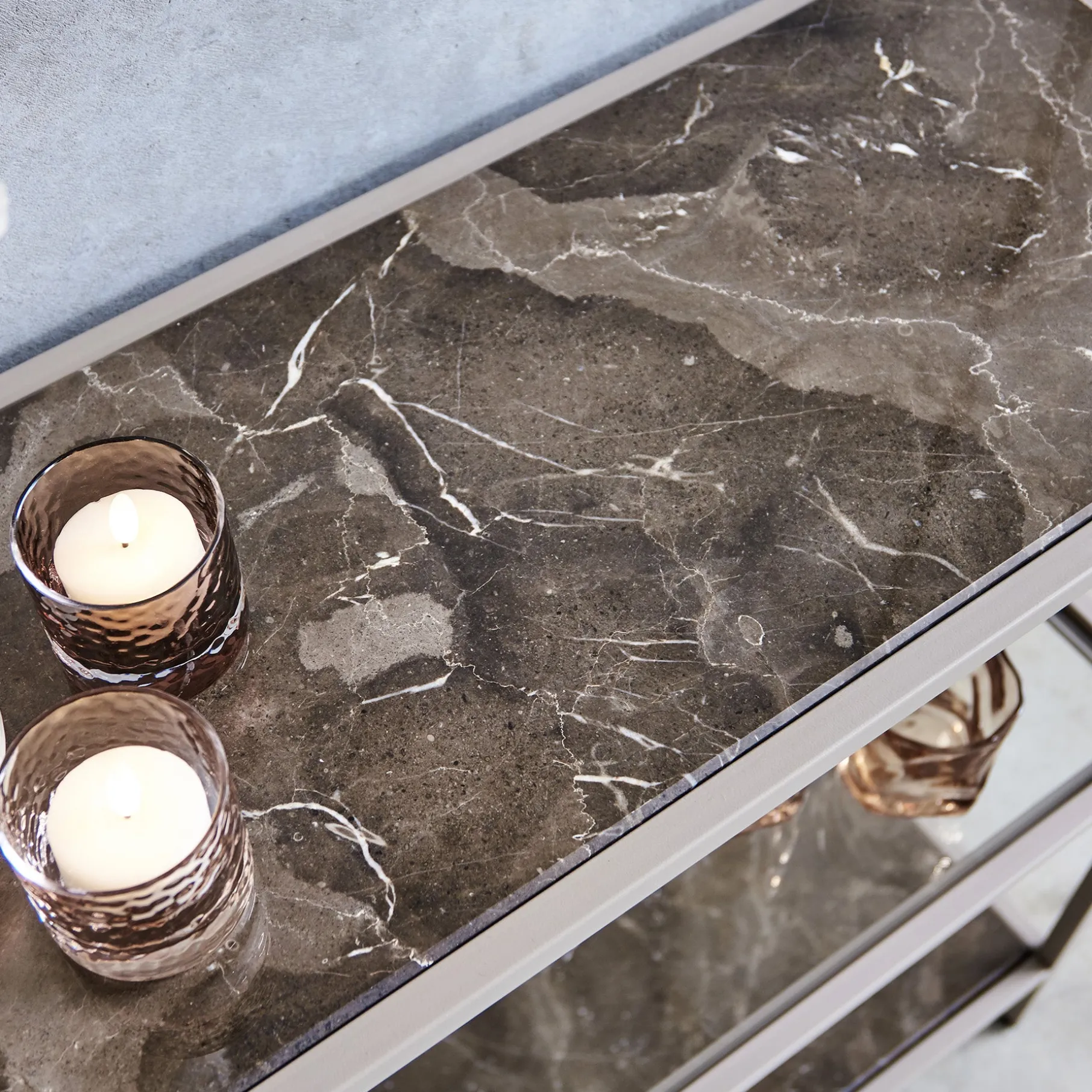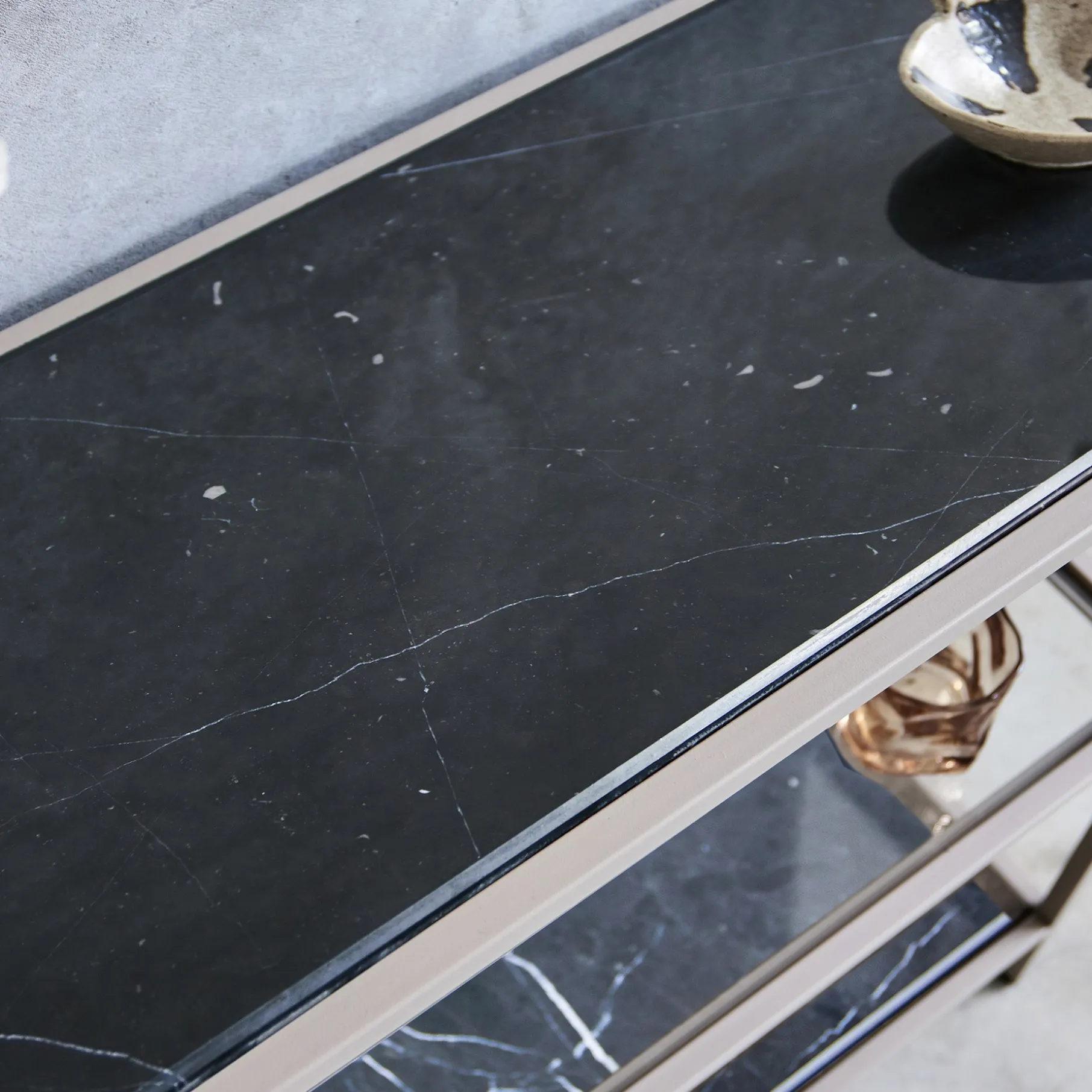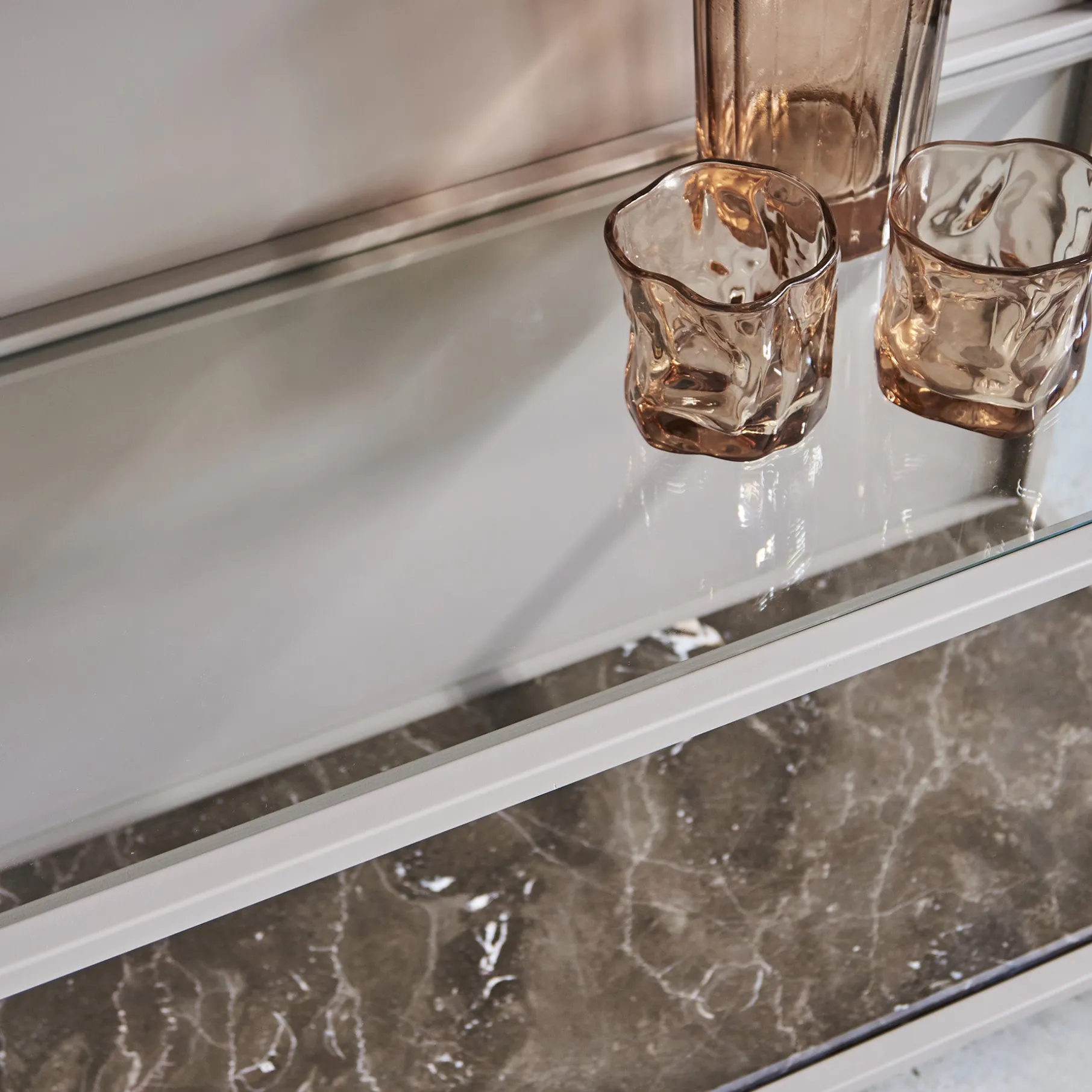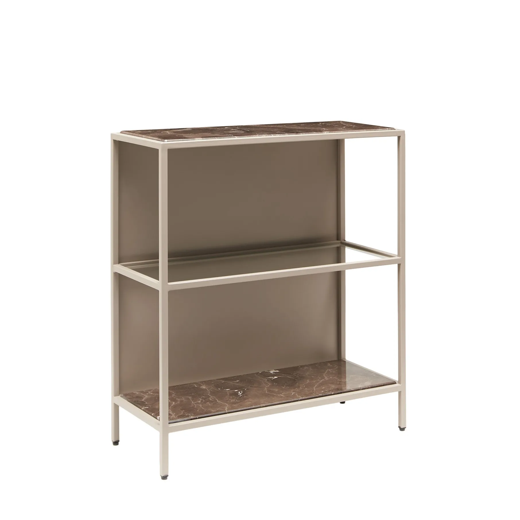 De rå, pulverlakkerede metaloverflader møder udskifteligt marmor i en sofistikeret kontrast og giver skabet en skarp karakter – industriel og raffineret på én og samme tid. Det åbne design lader lyset vandre frit og giver dit interiør plads til at ånde og træde frem.