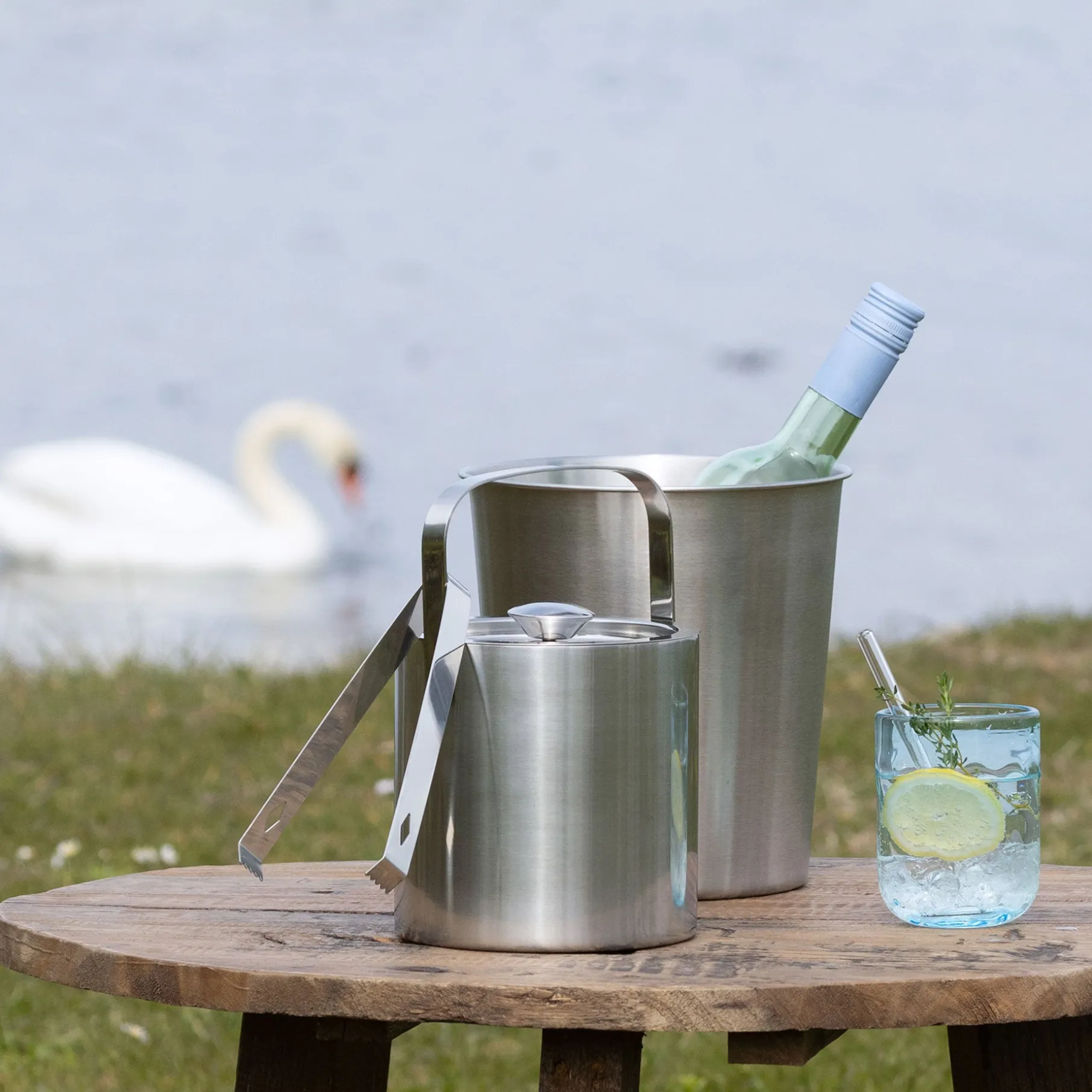 Vinkøleren er lavet af blankpoleret rustfrit stål og er lavet i et minimalistisk design. Den kan indeholde mange isterninger og nedkøle både champagne og vinflasker på en elegant måde.