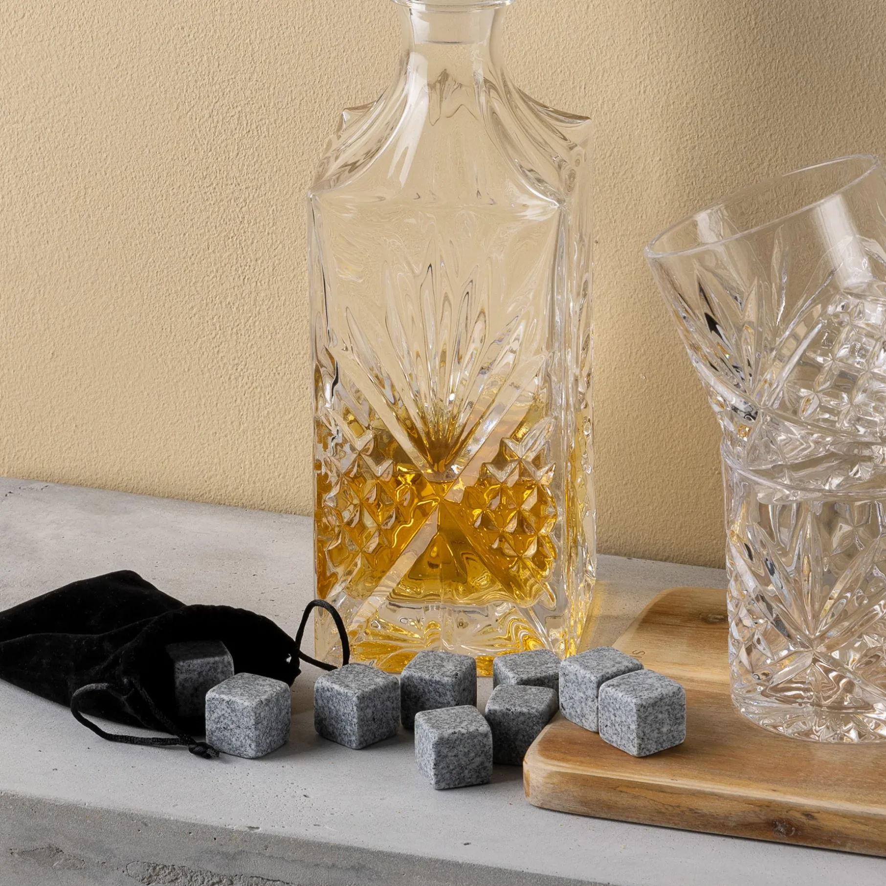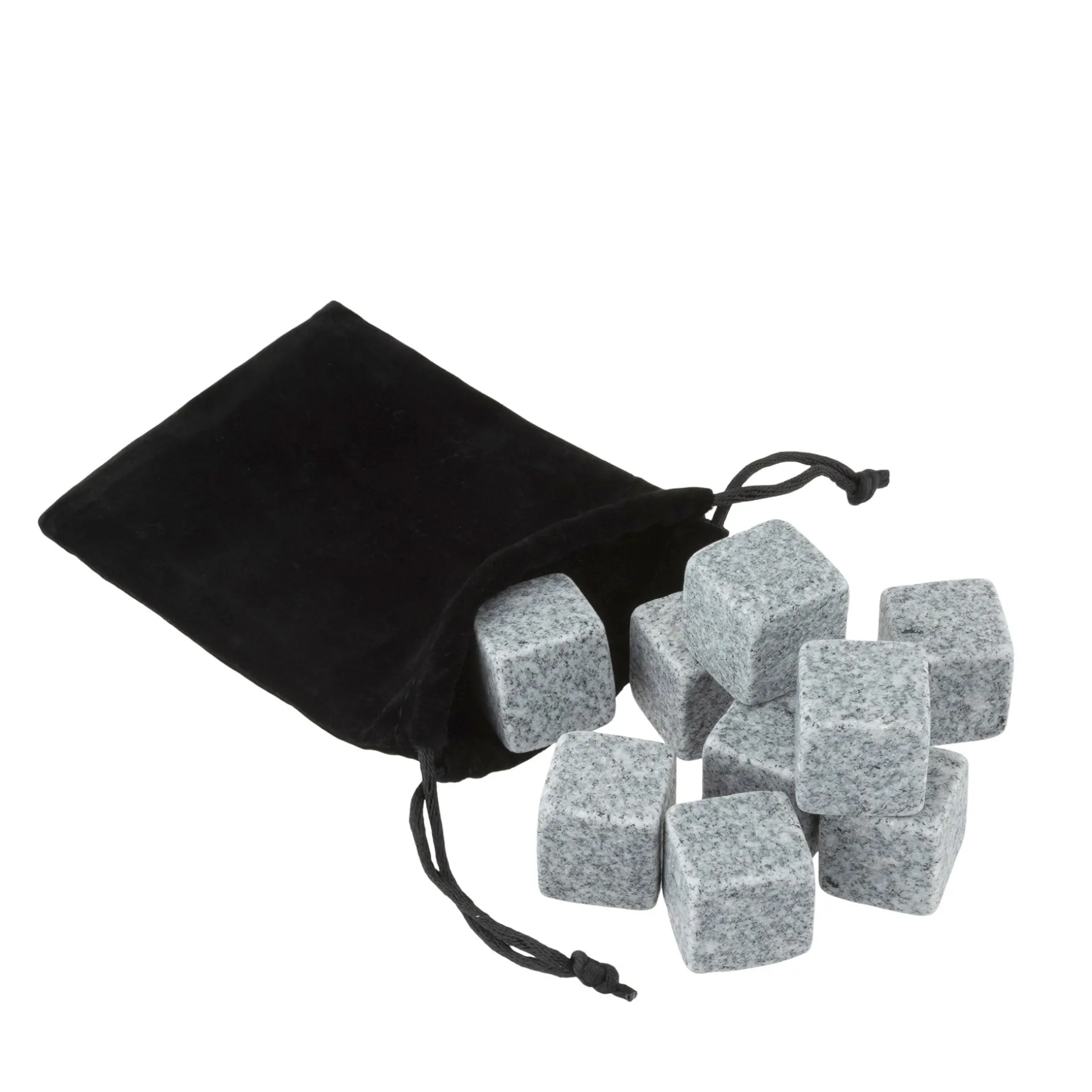 9 stk. whiskysten i granit med god køleeffekt. De bruges i stedet for almindelige isterninger, til at nedkøle whisky eller andre former for spiritus, uden at den bliver fortyndet af vand fra isterninger.