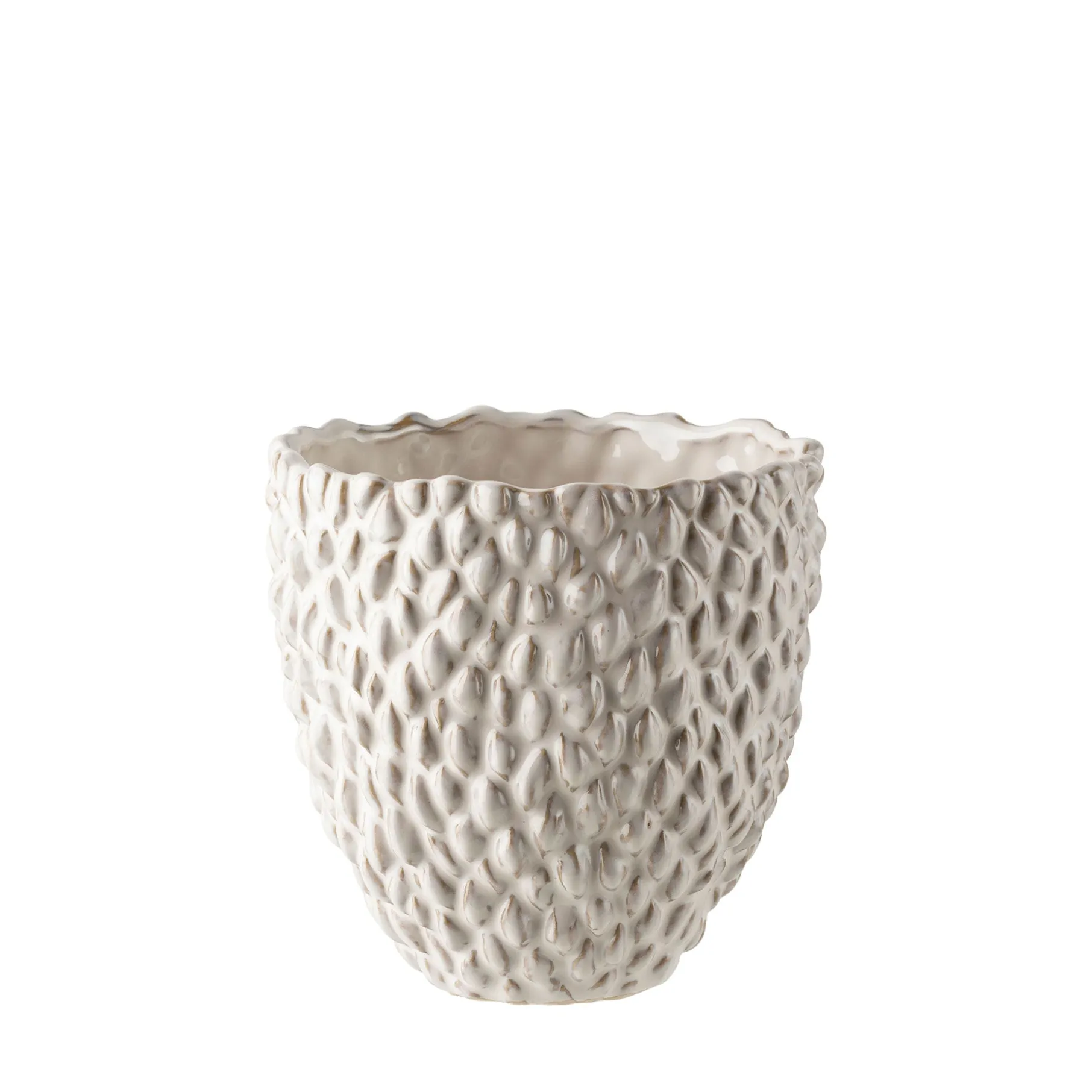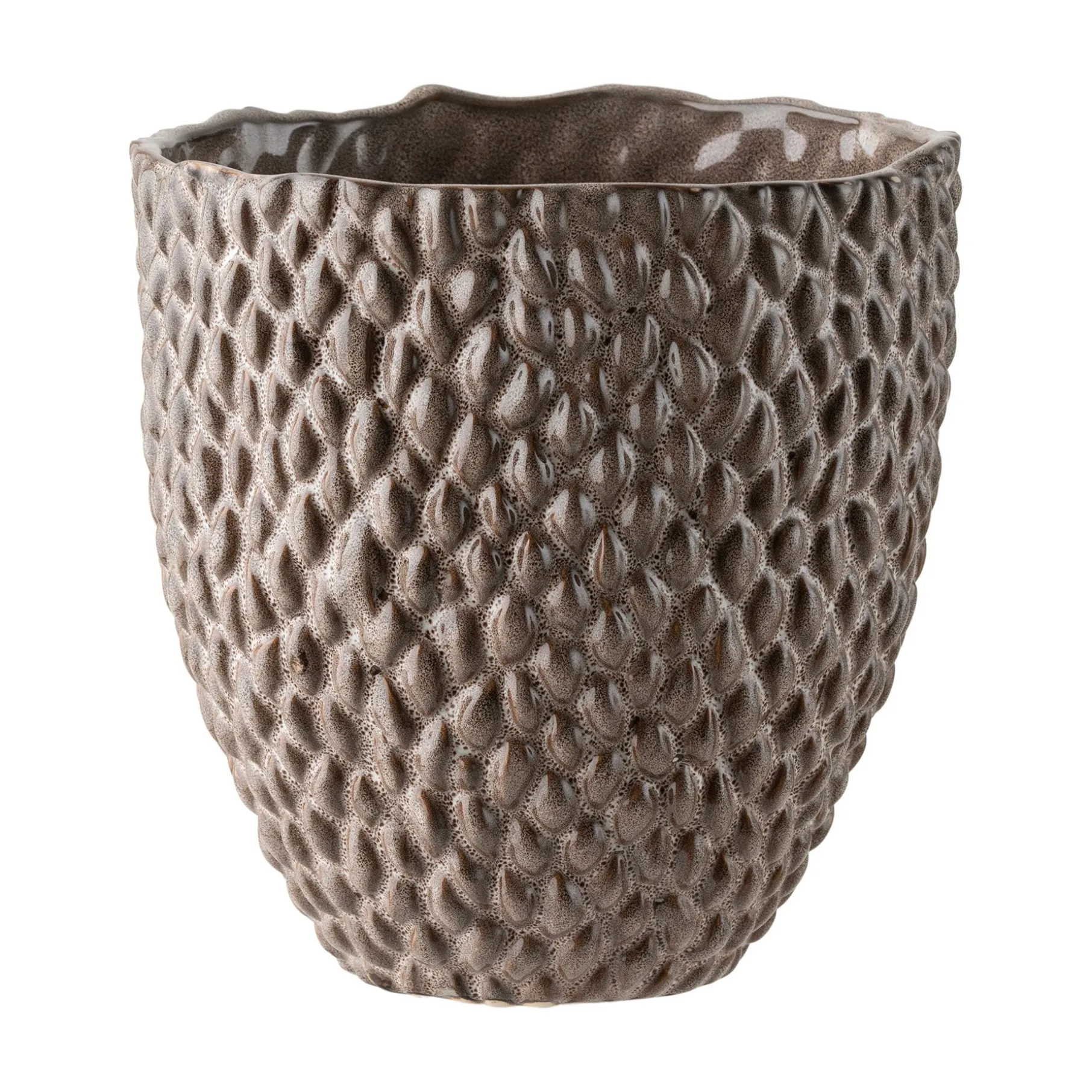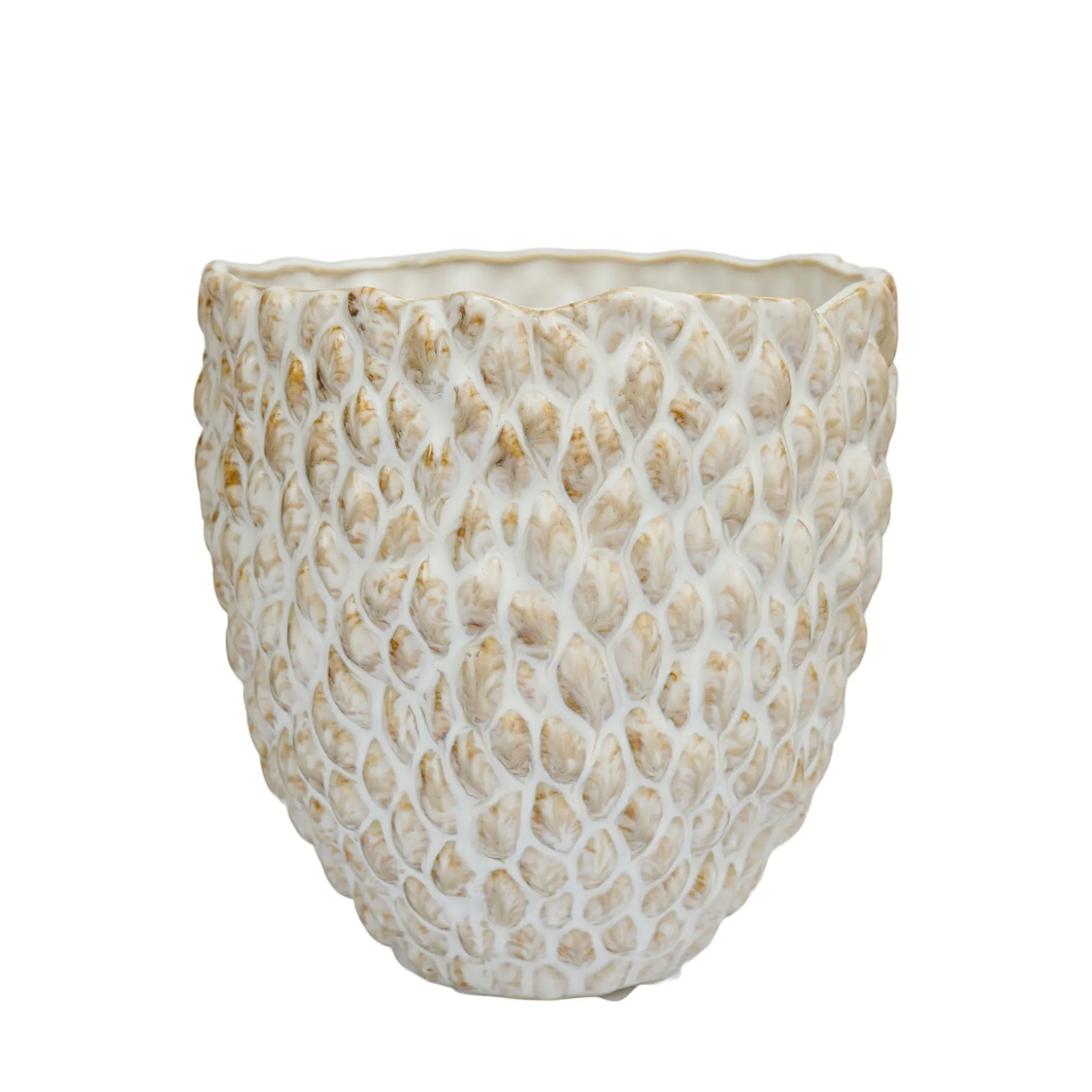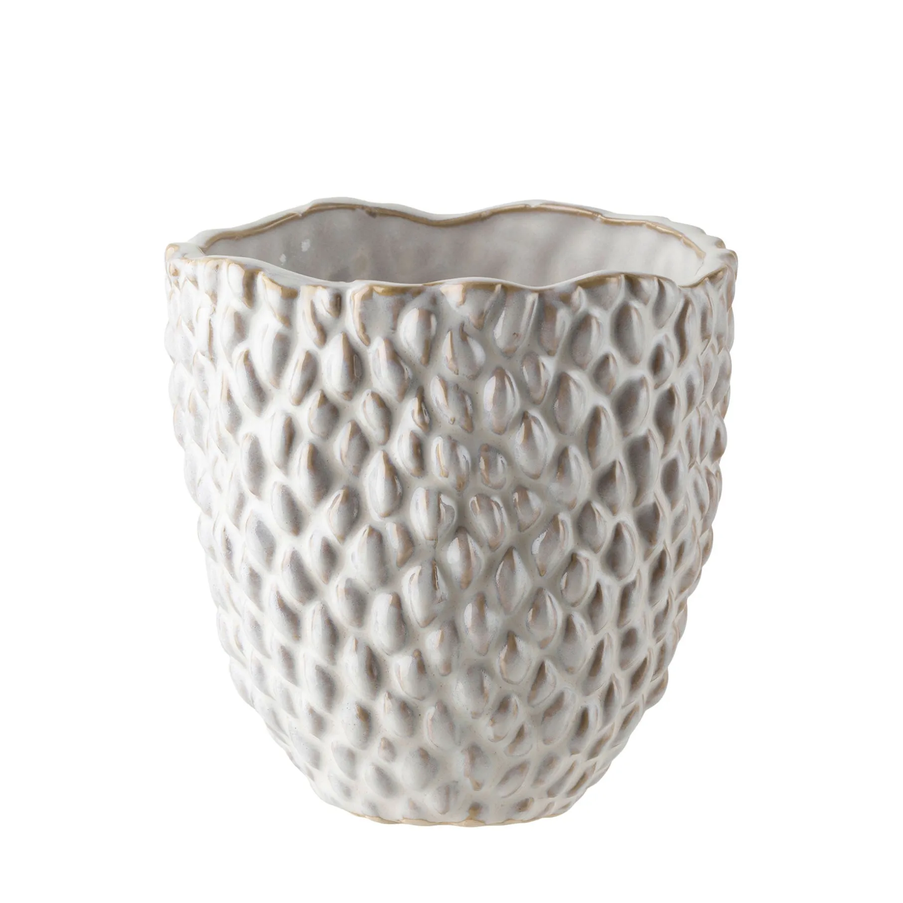 Urtepotte i glaseret stentøj, med en dekorativ struktur og en organisk formet kant.