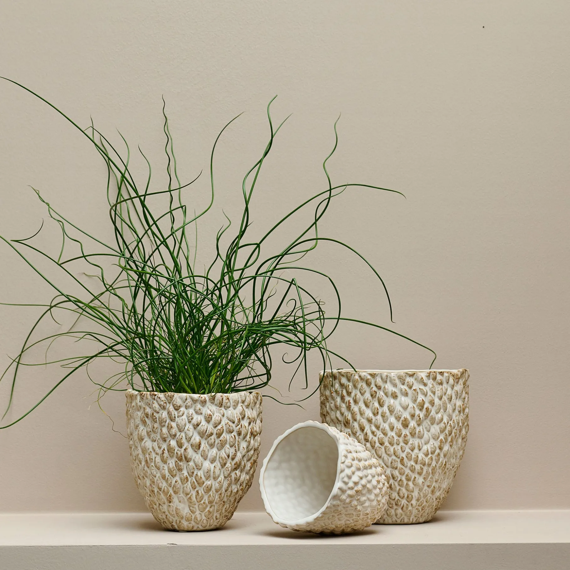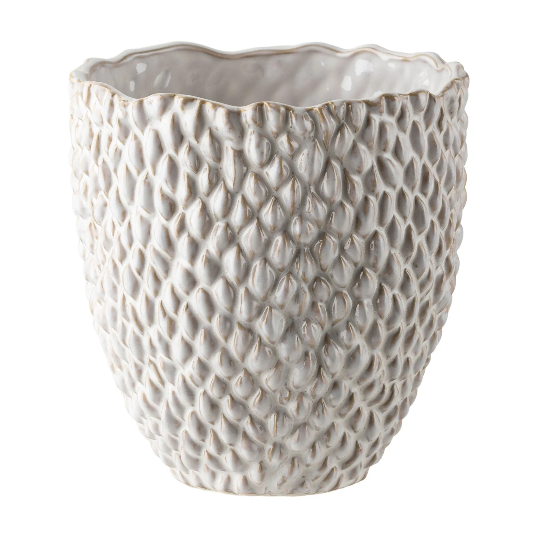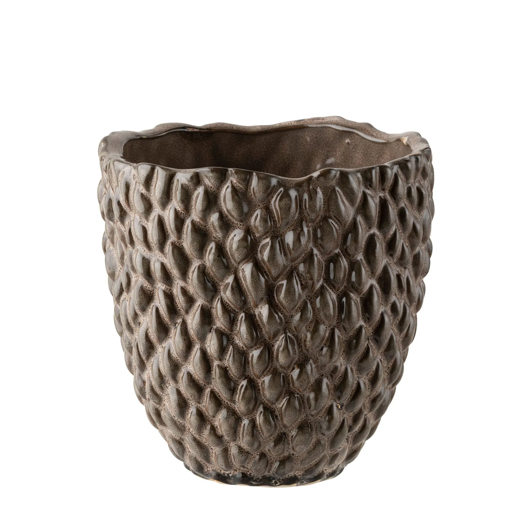 Urtepotte i glaseret stentøj, med en dekorativ struktur og en organisk formet kant.