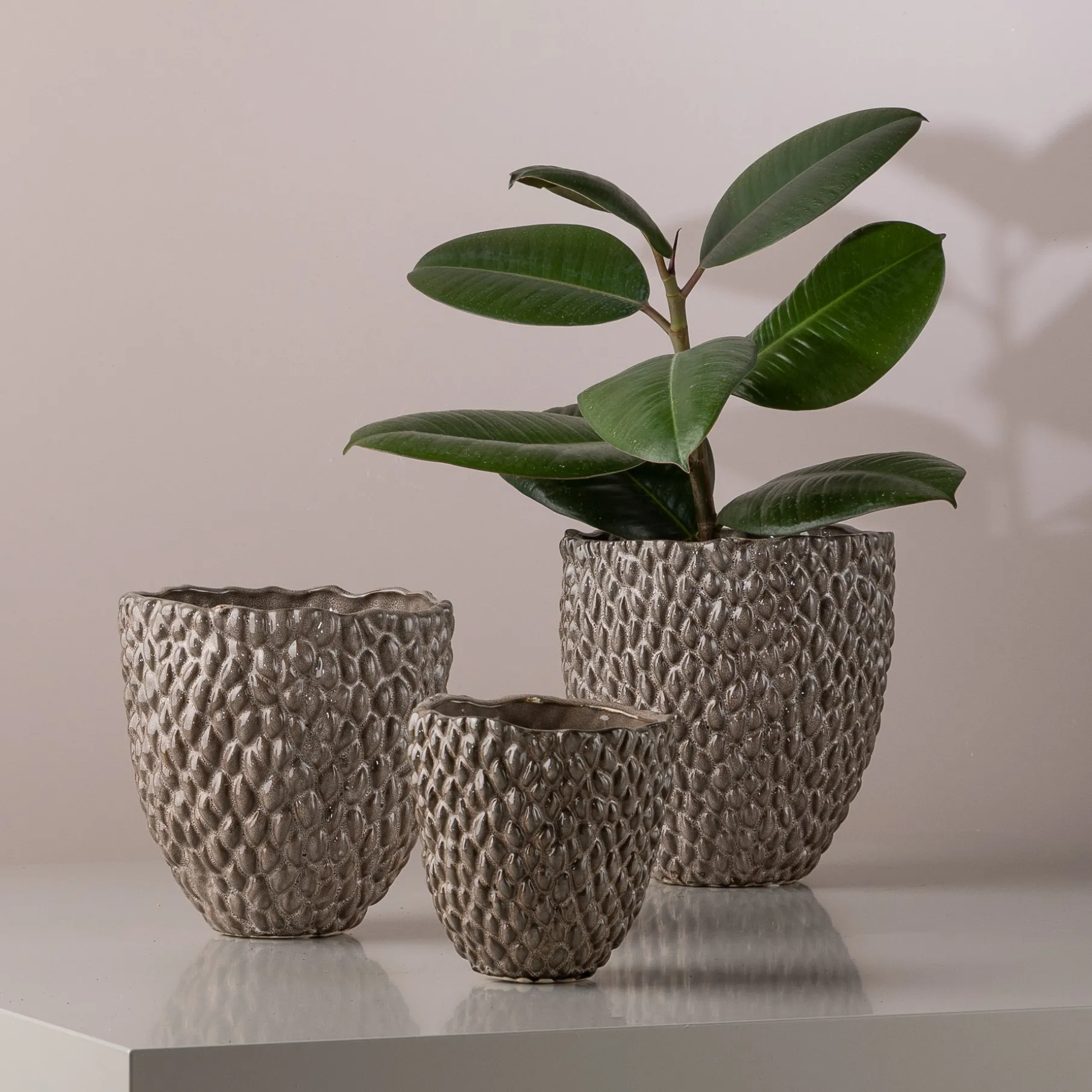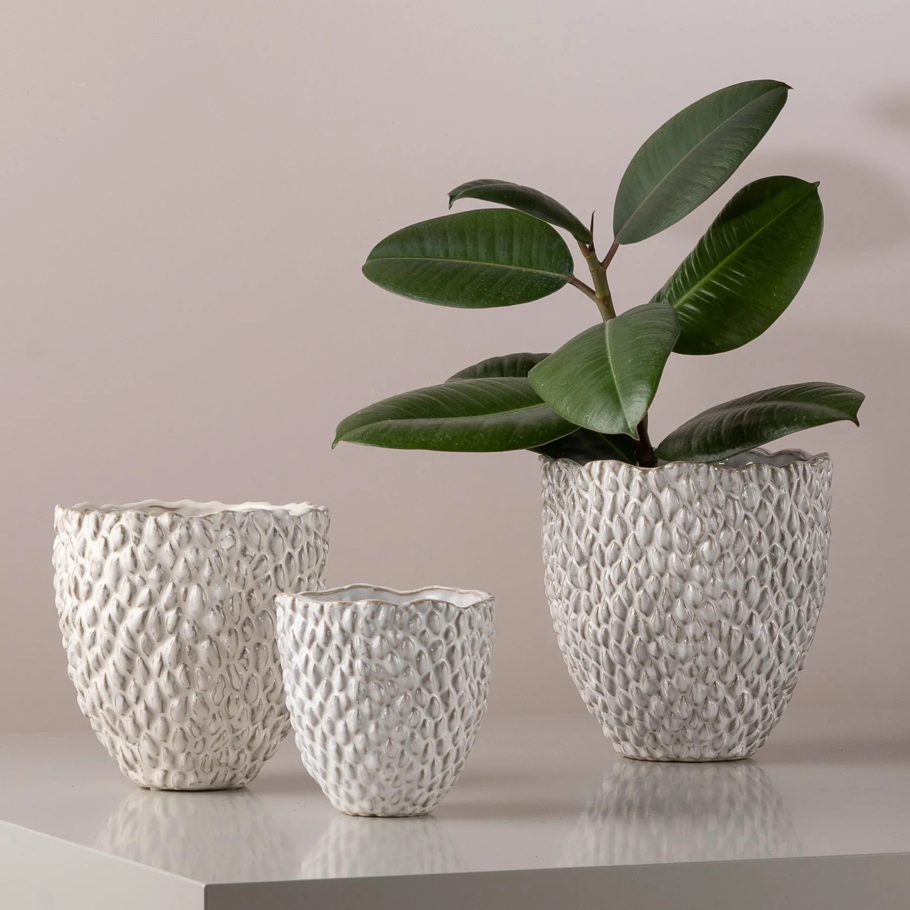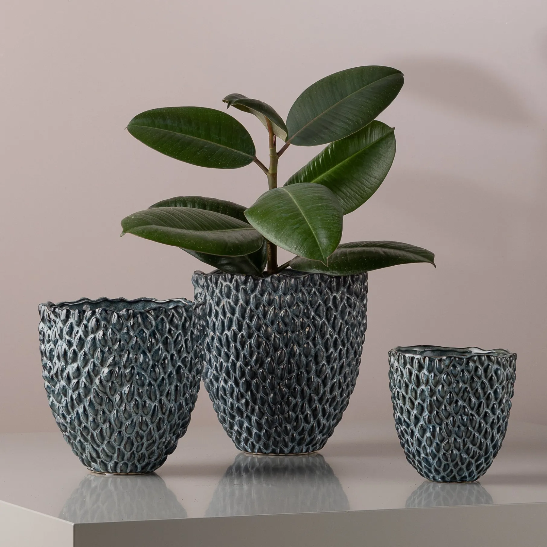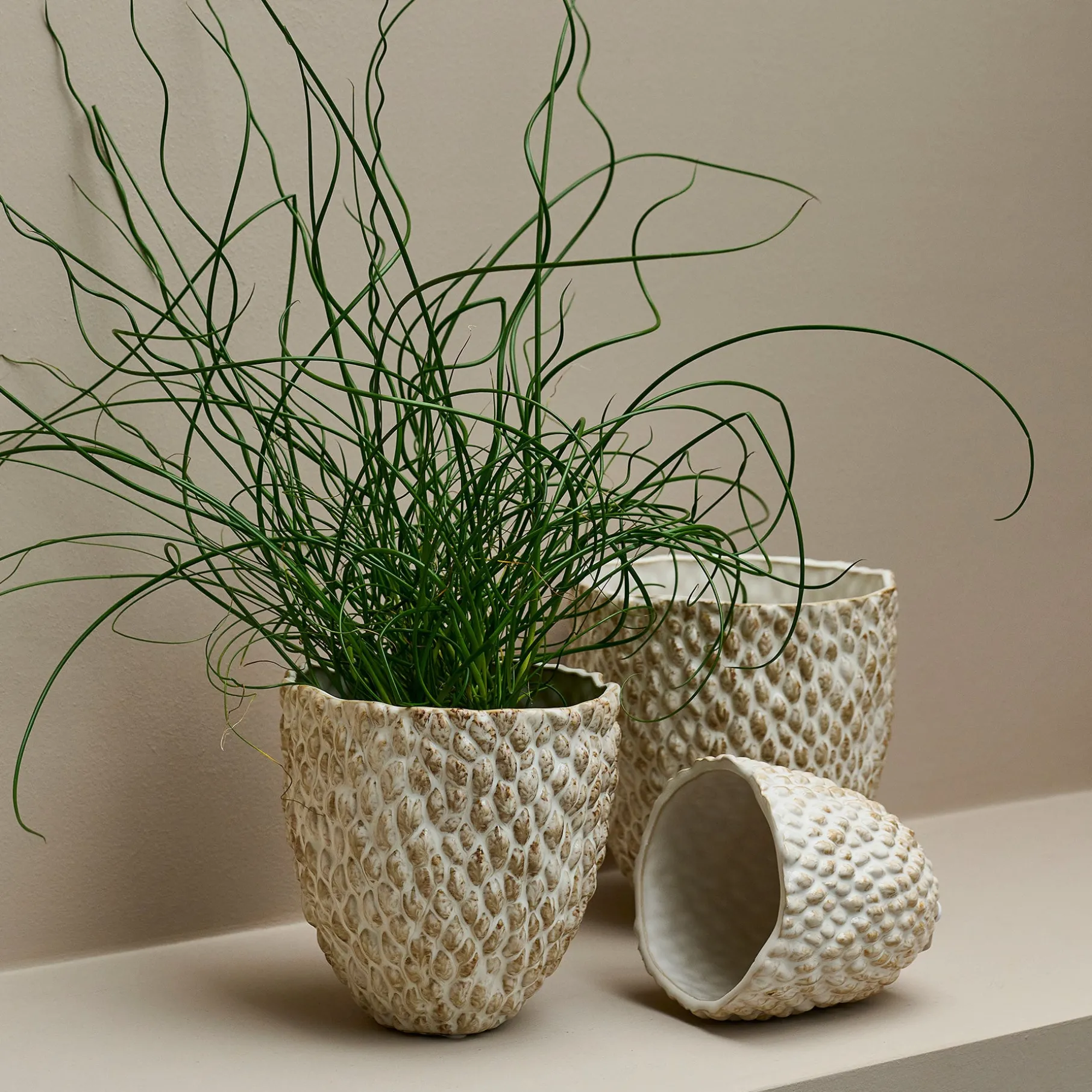 Urtepotte i glaseret stentøj, med en dekorativ struktur og en organisk formet kant.