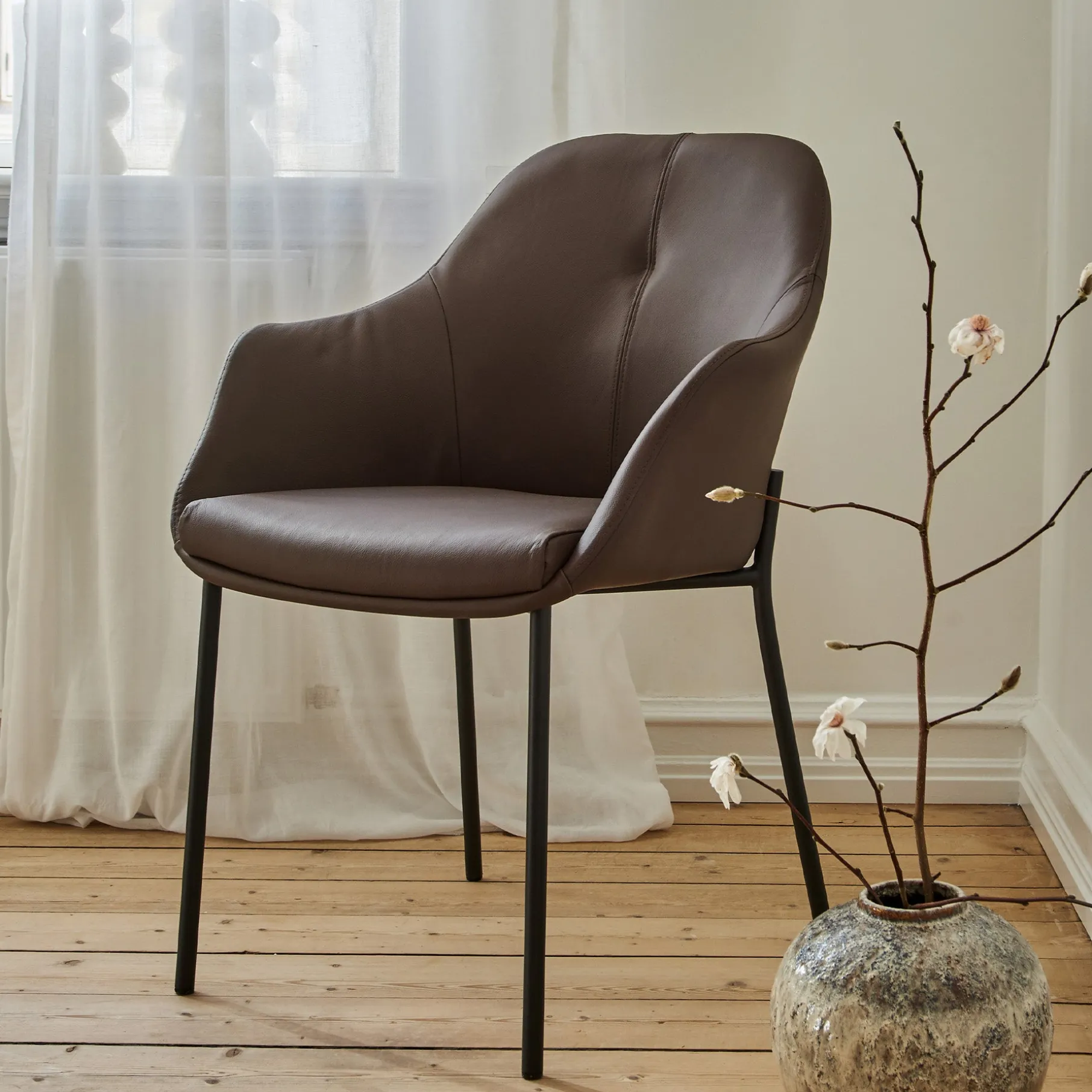Giv din spisestue et stilfuldt løft med New Age spisebordsstol i læder, hvor luksus møder funktionalitet. Stolen er designet med et eksklusivt og tidløst udtryk, der kombinerer ægte læder med robuste, sortlakerede metalben – en perfekt balance mellem elegance og moderne minimalisme.
