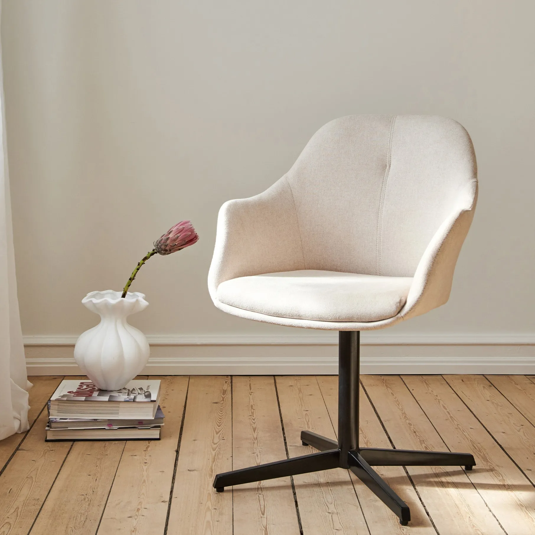 Stolen står stabilt på en sort pulverlakeret metalbase og er udstyret med en smart drejefunktion, der giver dig ekstra fleksibilitet og bevægelsesfrihed.