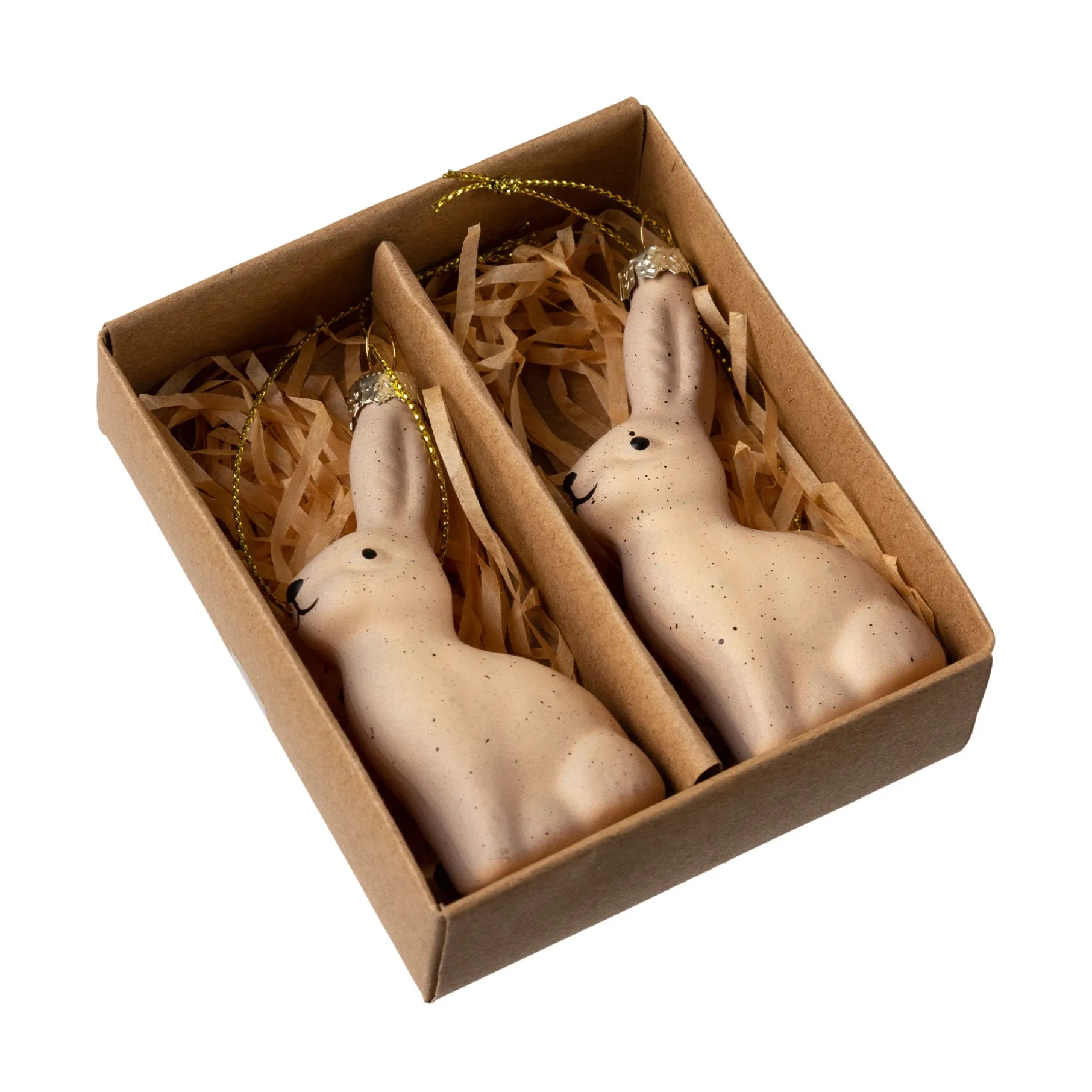 2 små søde påskeharer i glas og med en fin guldfarvet snor