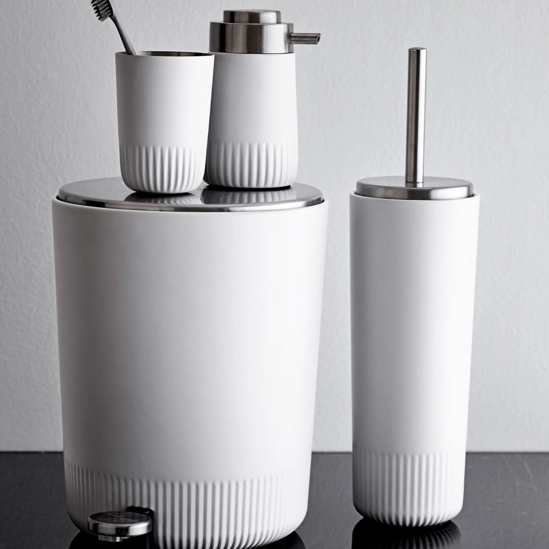 Smuk bad-serie fra Södahl, hvor der findes sæbedispenser, tandbøsteholder, toiletbørste og pedalspand. Serien er designet i enkelt og stilrent look, passer ind på det moderne badeværelse.