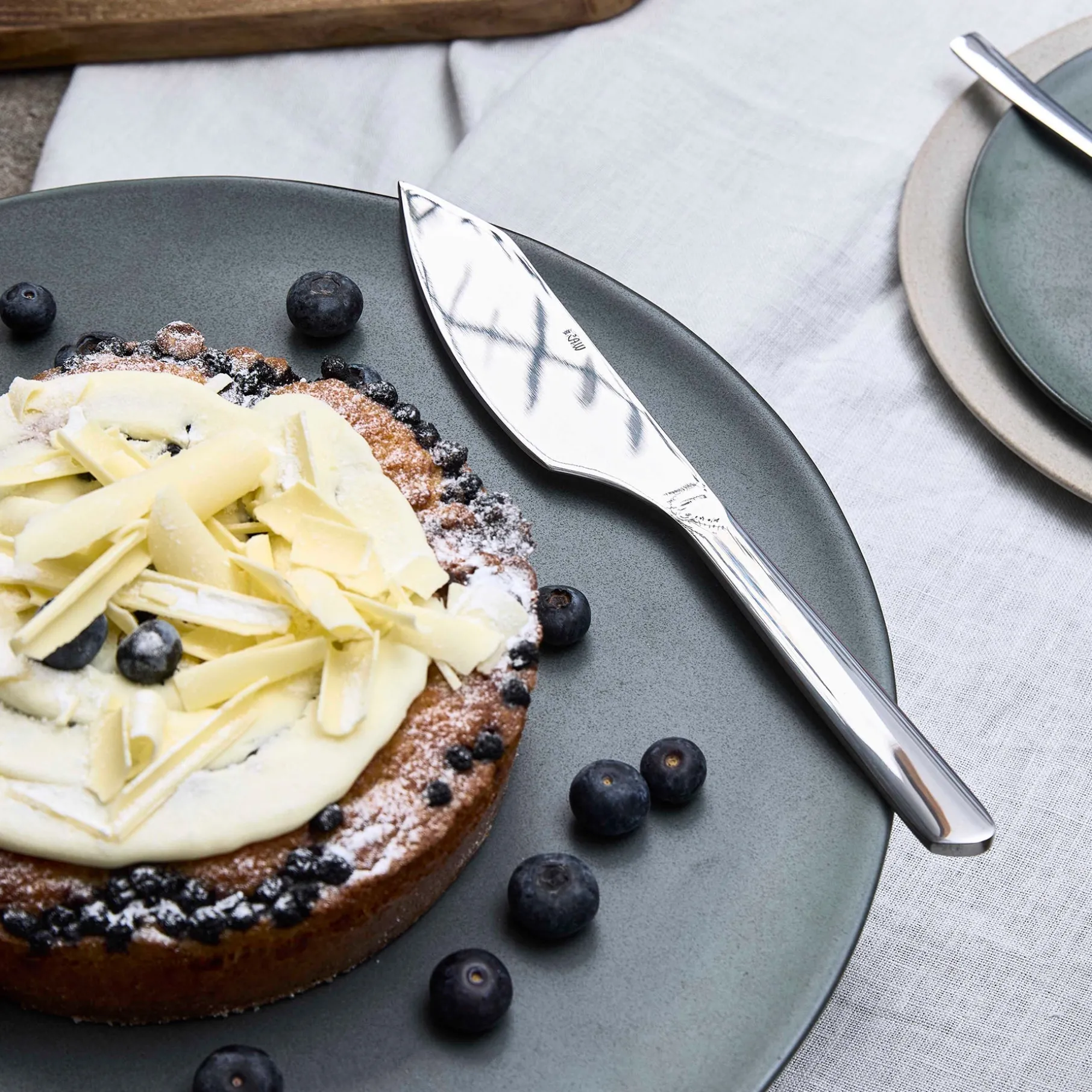RAW lagkagekniven er designet til at passe smukt ind i RAW universet og komplementerer de øvrige bestikdele som RAW kagespade og kagegafler. Dens enkle og nordiske æstetik gør den ideel til en stilfuld borddækning, især sammen med det karakteristiske RAW stentøj.