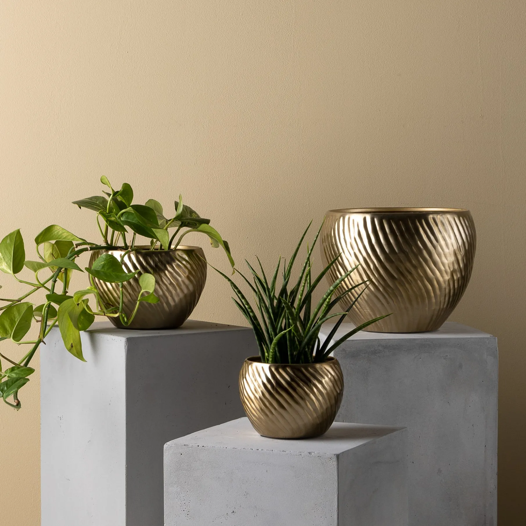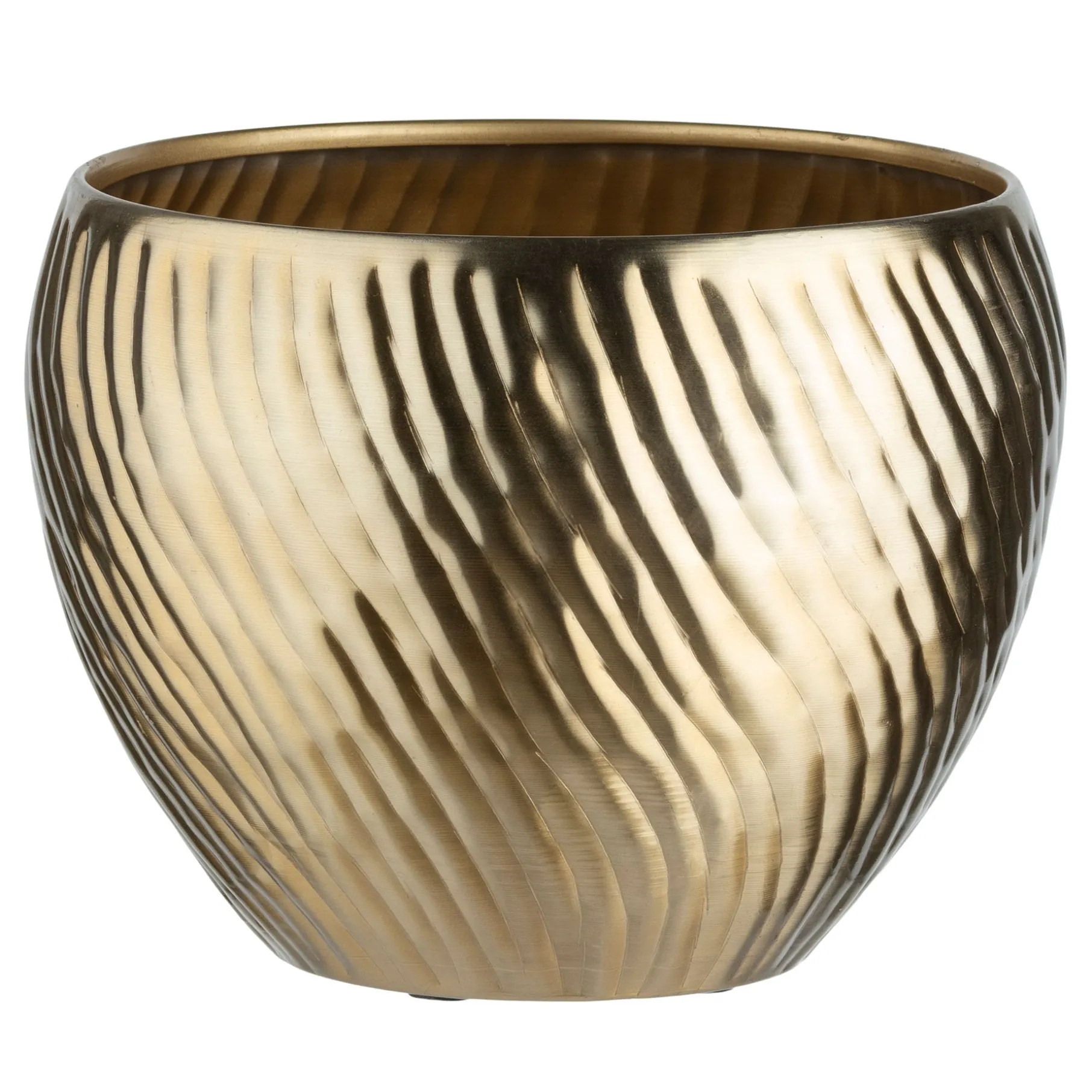 Løft din indretning med disse eksklusive urtepotteskjulere i messing, der forener luksus og naturlig skønhed i ét udtryk. Den elegante, bølgede overflade giver et sofistikeret spil i lyset og skaber en varm kontrast til plantens grønne liv.