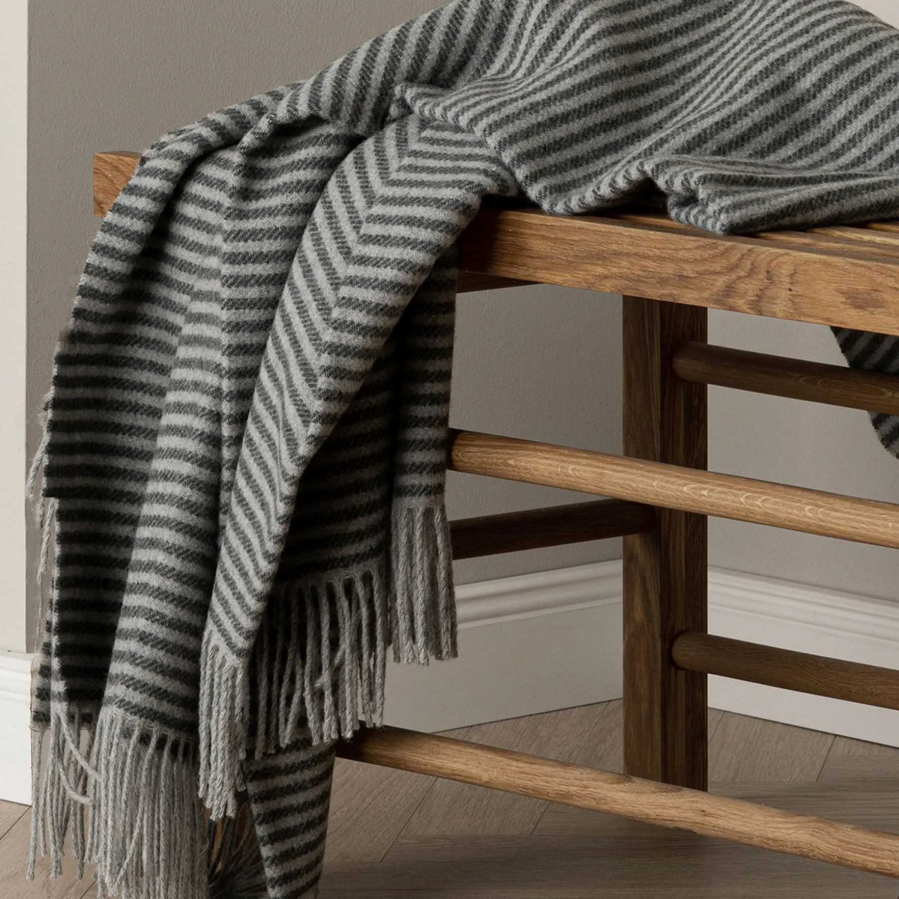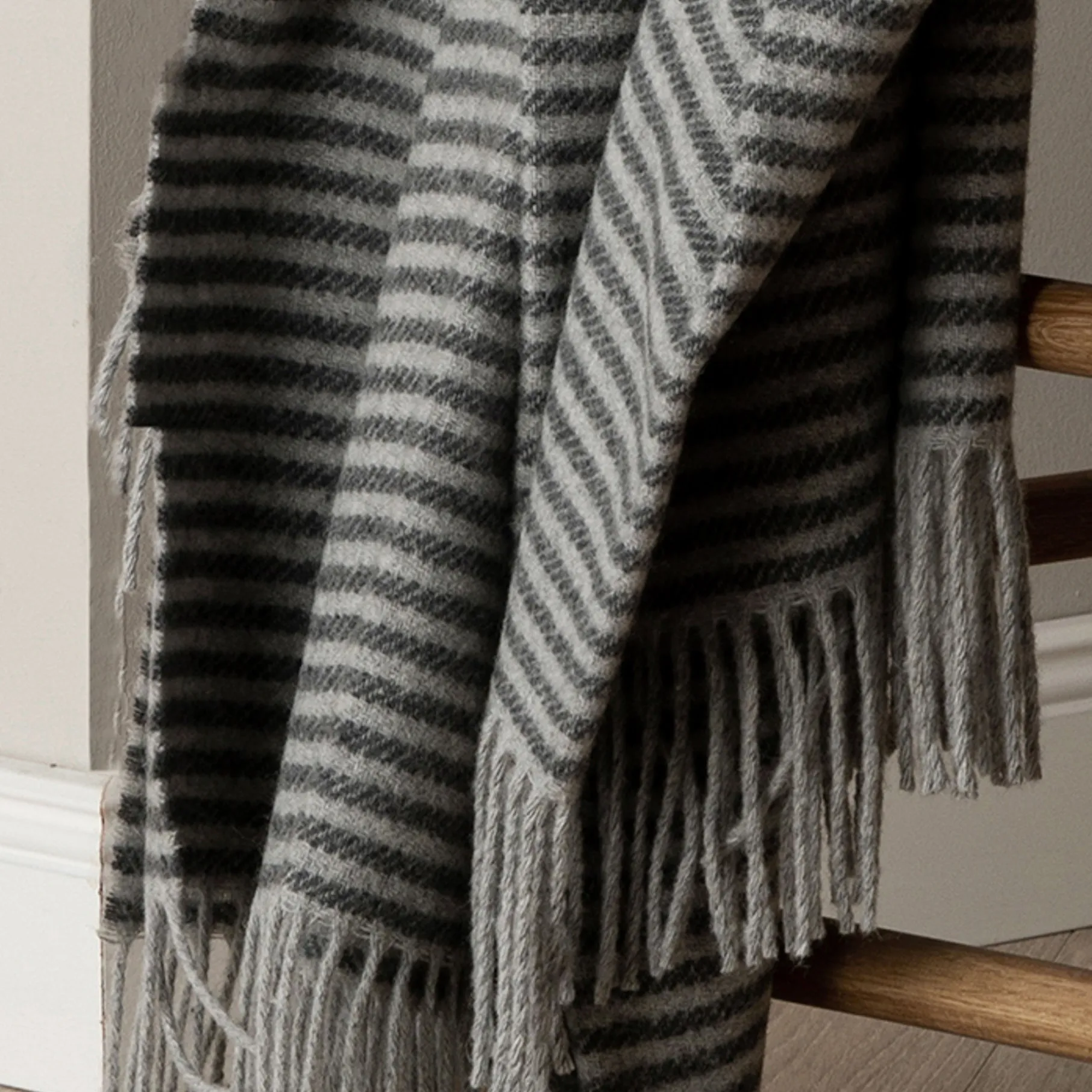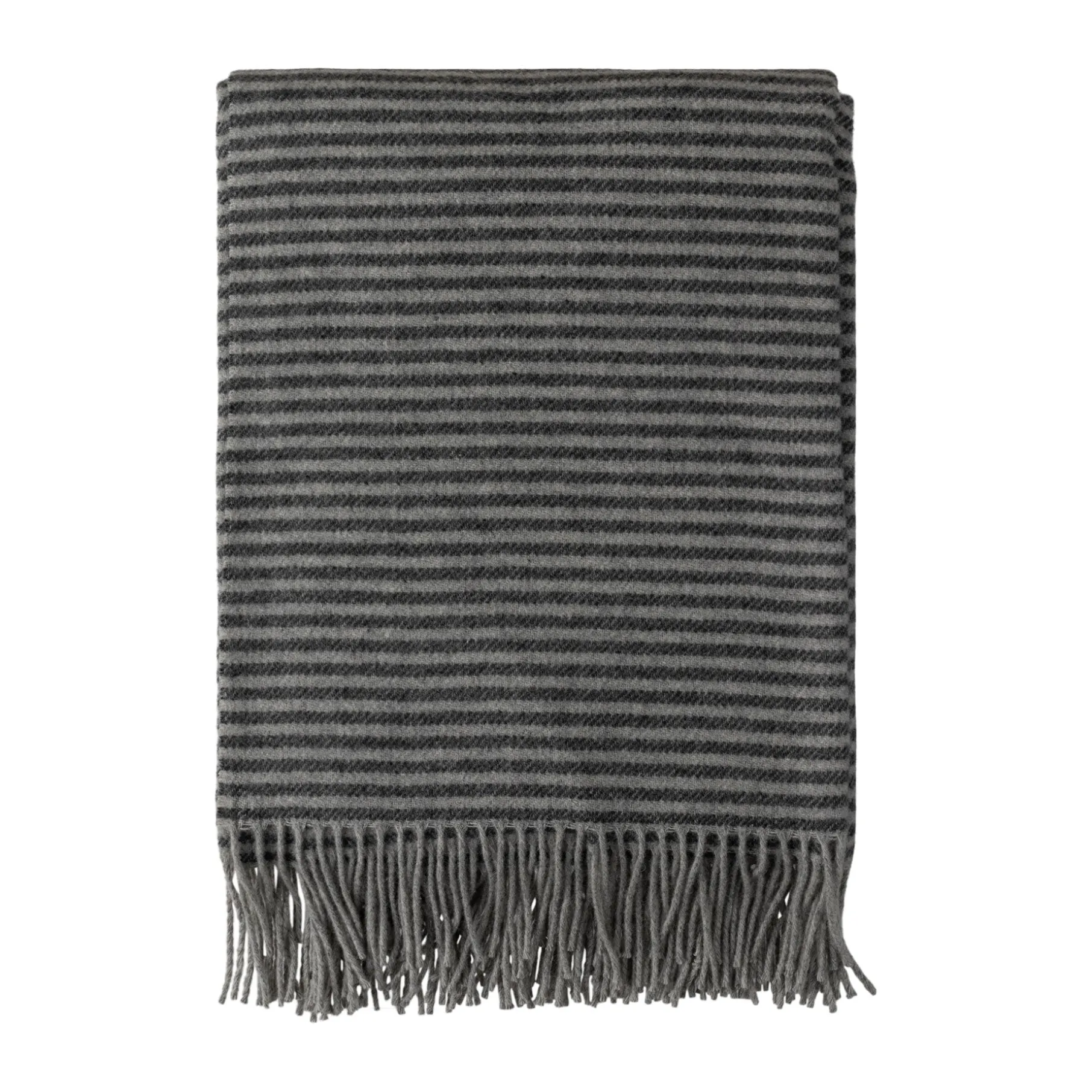 Plaiden har et tidløst mønster og frynser i begge ender.