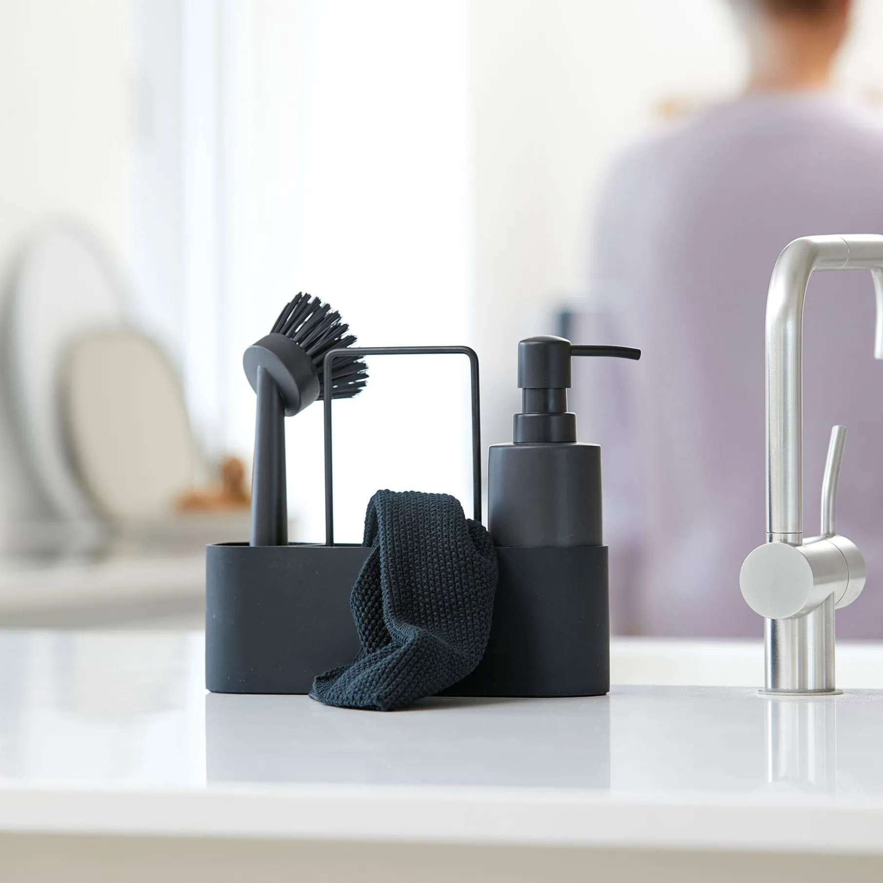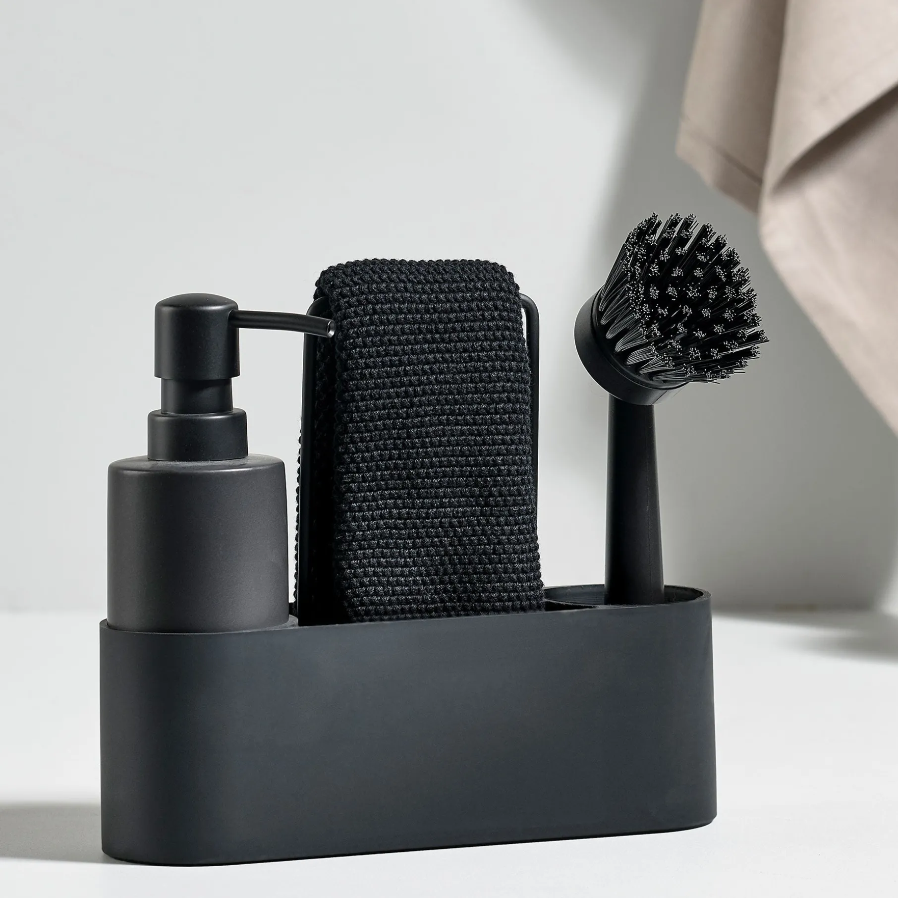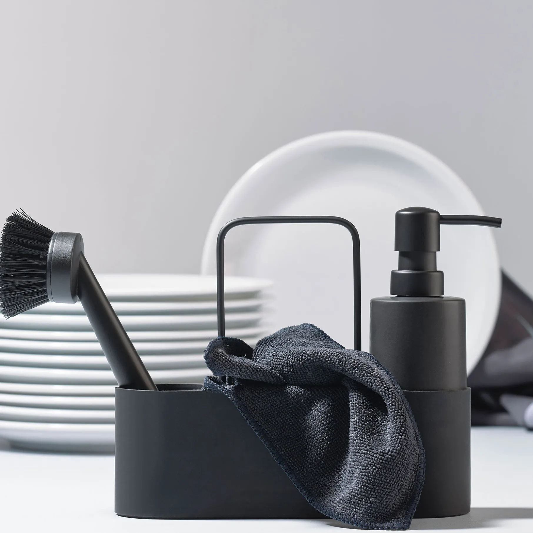 Smart alt-i-ét opvaskesæt med silikonebeholder, sæbedispenser, klud og opvaskebørste – så er du klar til at vaske op. Sættet er skabt i et minimalistisk, sort design, der gør, at det passer ind i de fleste hjem.