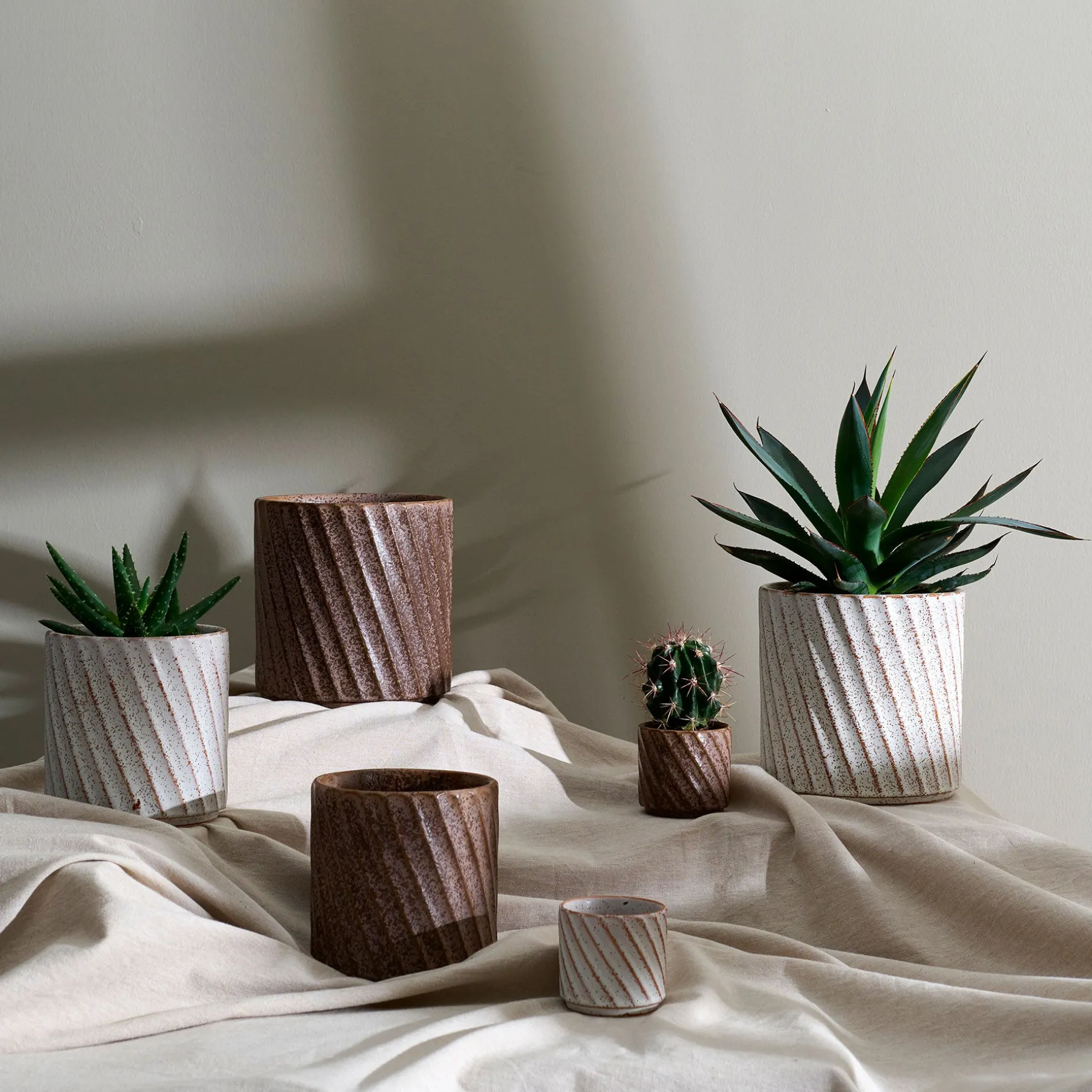 Swirl urtepotte i stentøj, med en rillet struktur der følger urtepottens runde form.