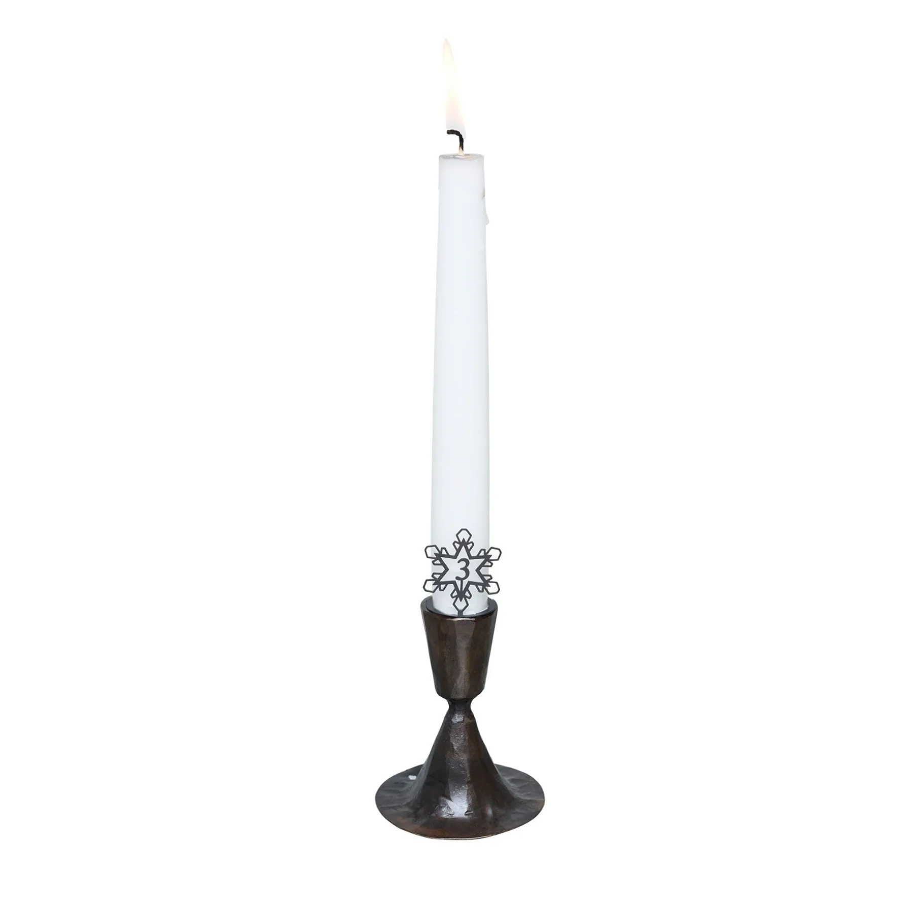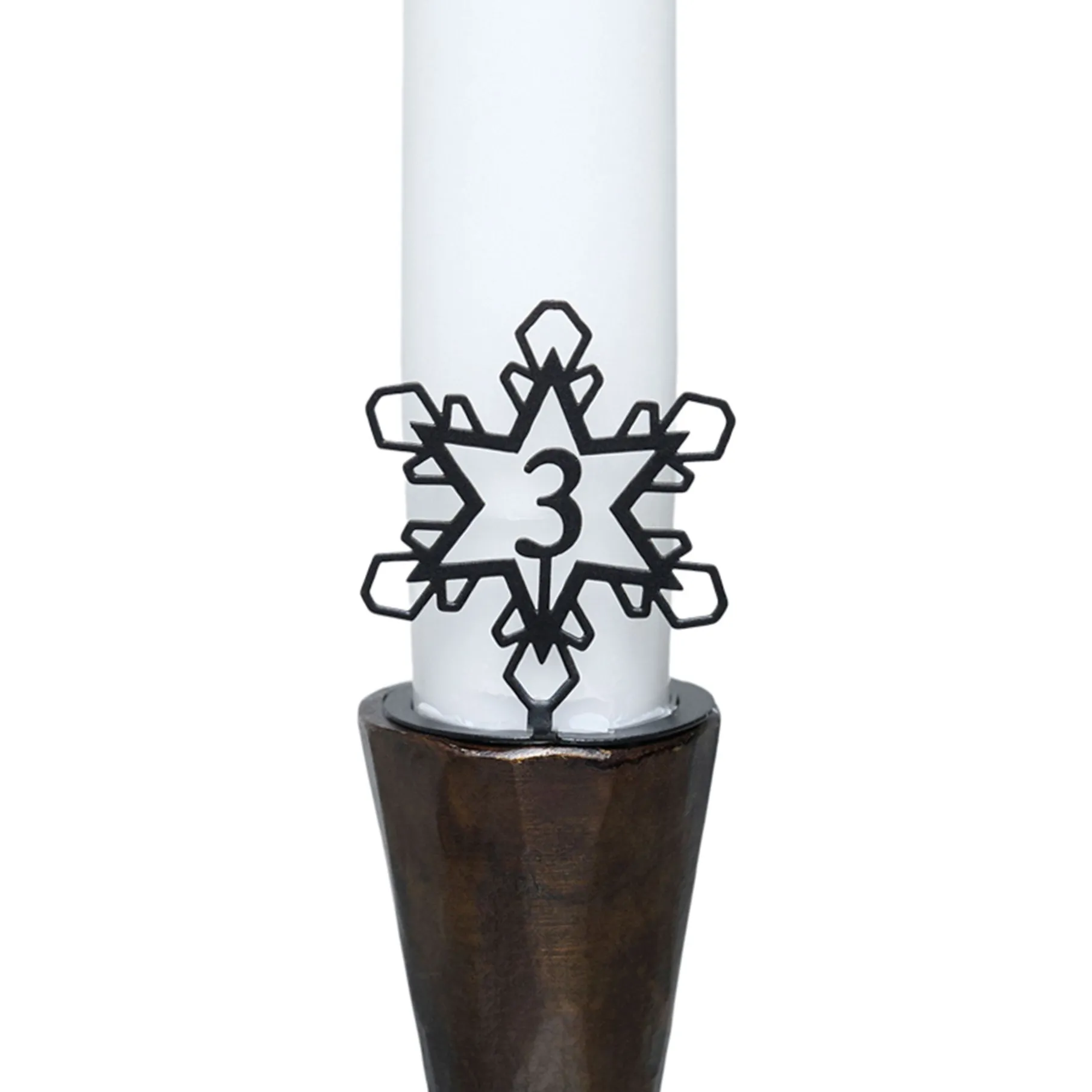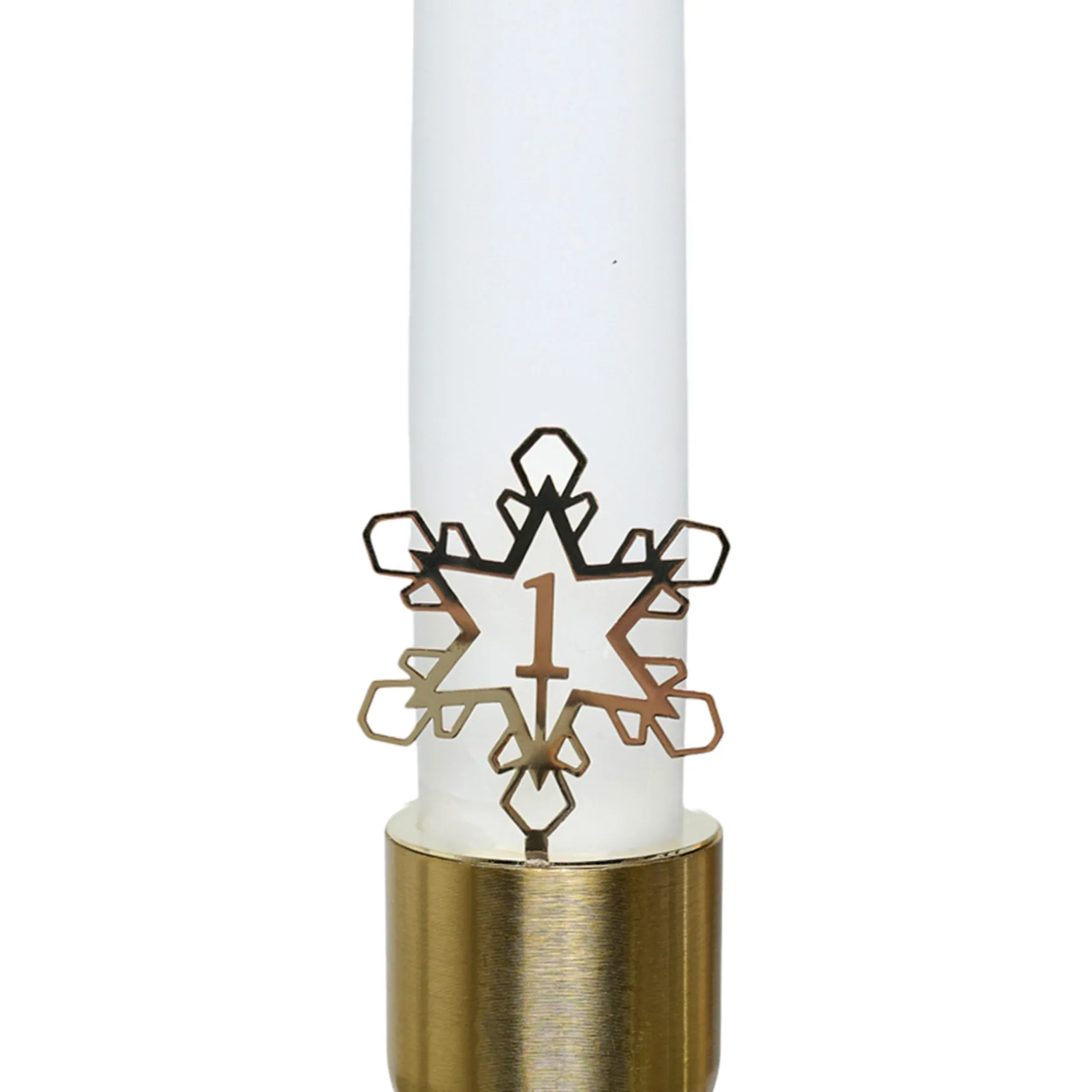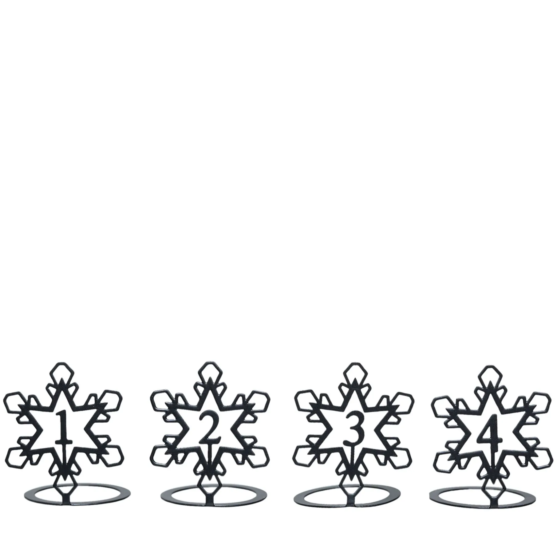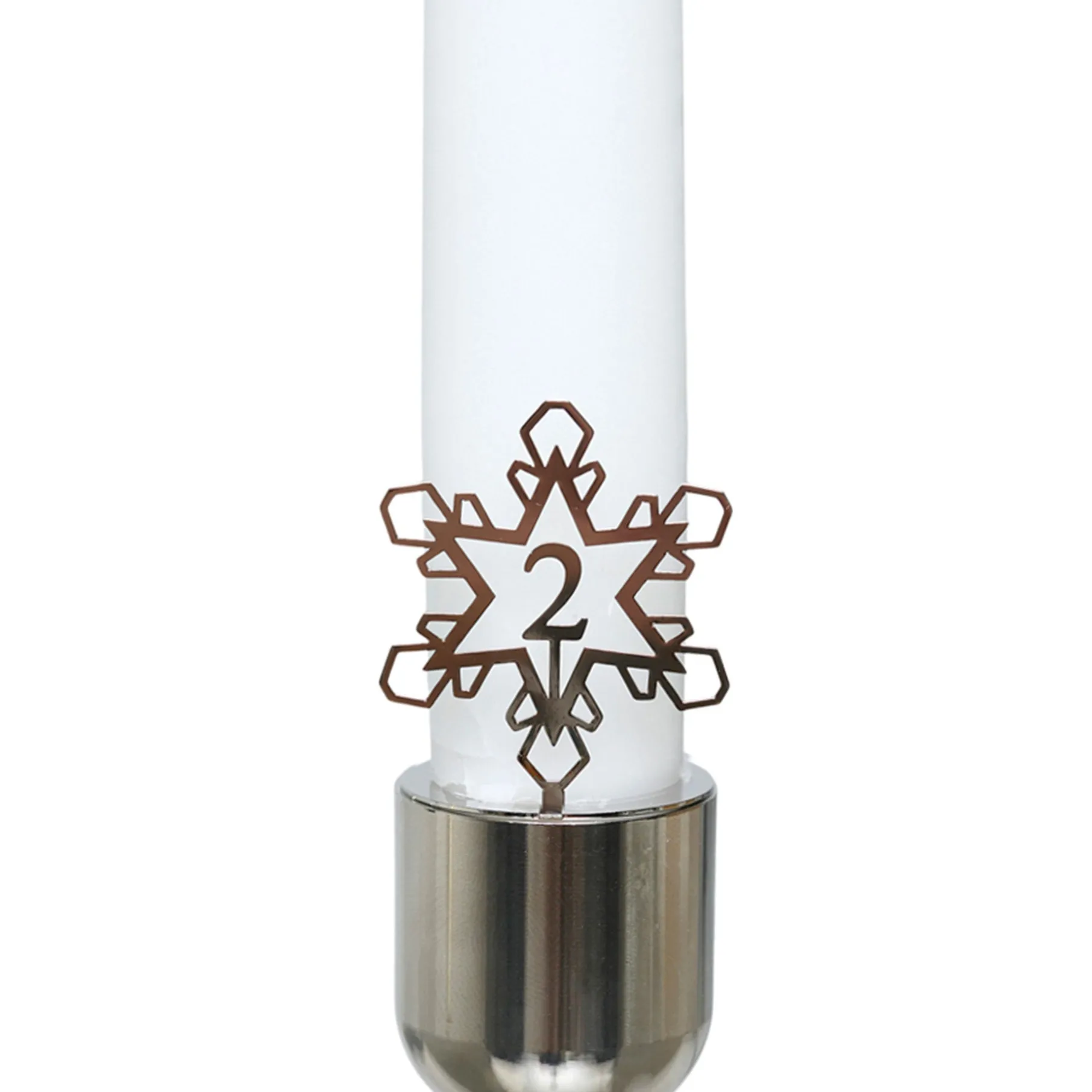 Dette sæt består af fire smukt udformede metallysestager, hver dekoreret med et stilfuldt snefnug-design med et tal fra 1 til 4 i midten, hvilket gør dem perfekte som adventslys.