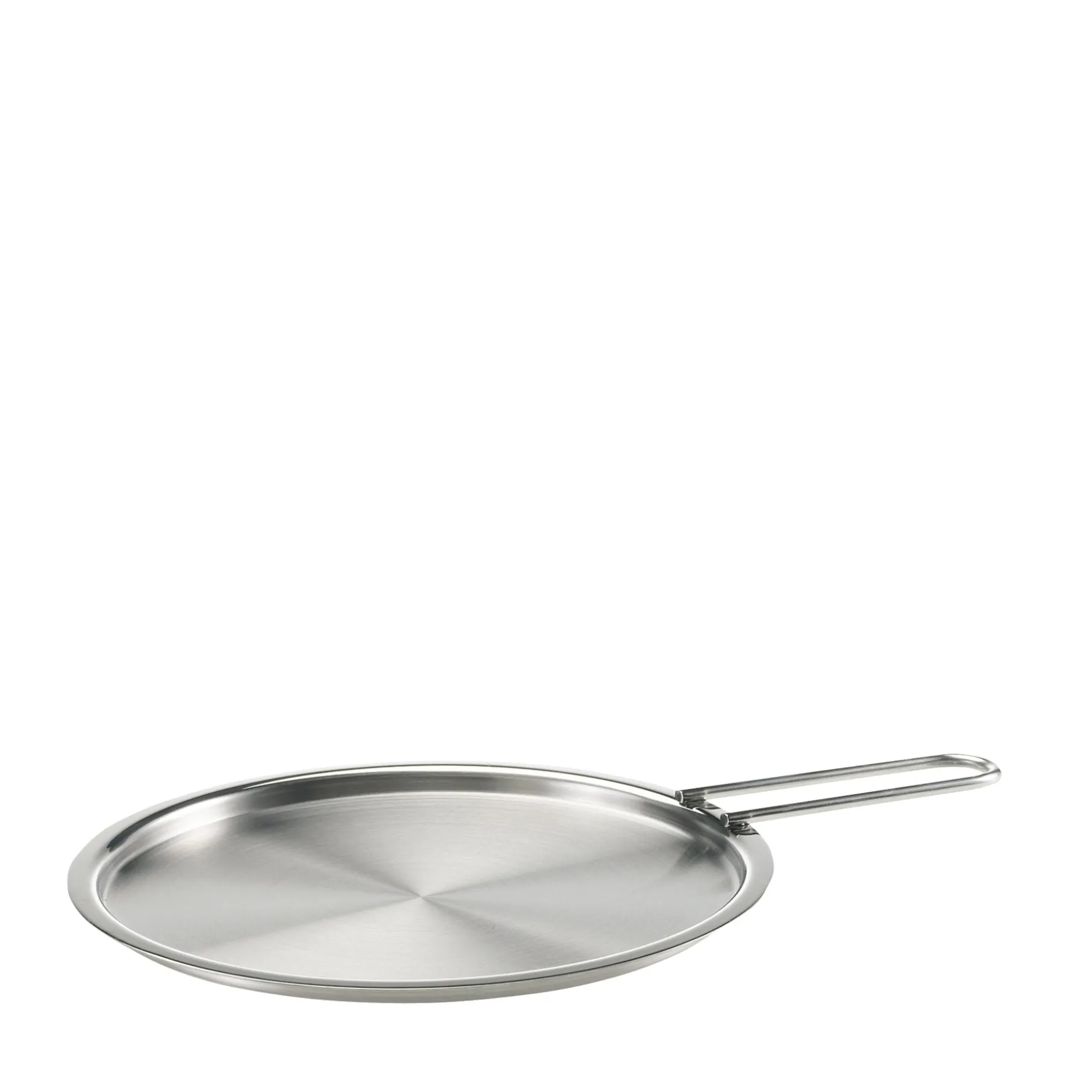 De flade tallerkenlåg i rustfrit stål kan stables inden i hinanden eller ophænges på kroge. Låget har “lange” håndtag anbragt på siden, så du kan se til maden uden at brænde dig. Under madlavning kan du holde ting varmt på låget.