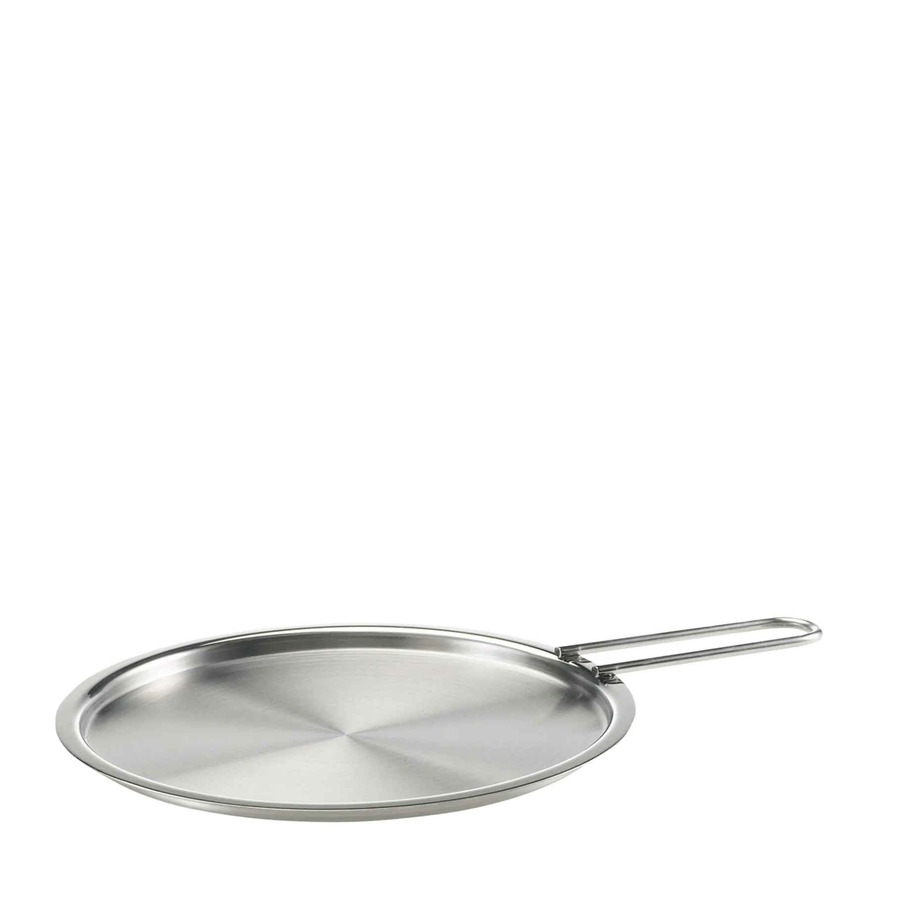 De flade tallerkenlåg i rustfrit stål kan stables inden i hinanden eller ophænges på kroge. Låget har “lange” håndtag anbragt på siden, så du kan se til maden uden at brænde dig. Under madlavning kan du holde ting varmt på låget.