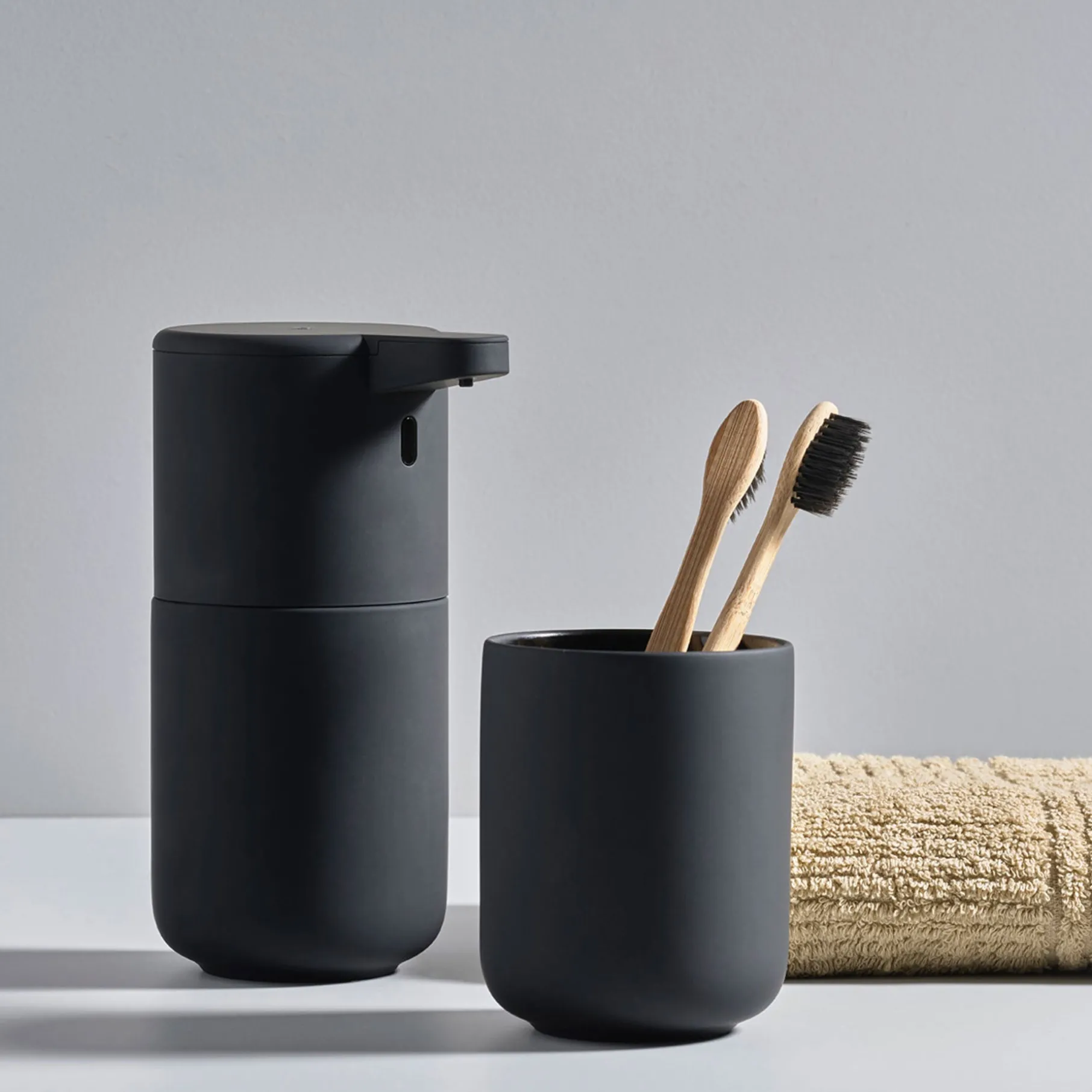 Tandbørstekruset fås i de fineste blide farver. Elementerne i badserien Ume giver et solidt og velafbalanceret udtryk – både for øje og hænder.