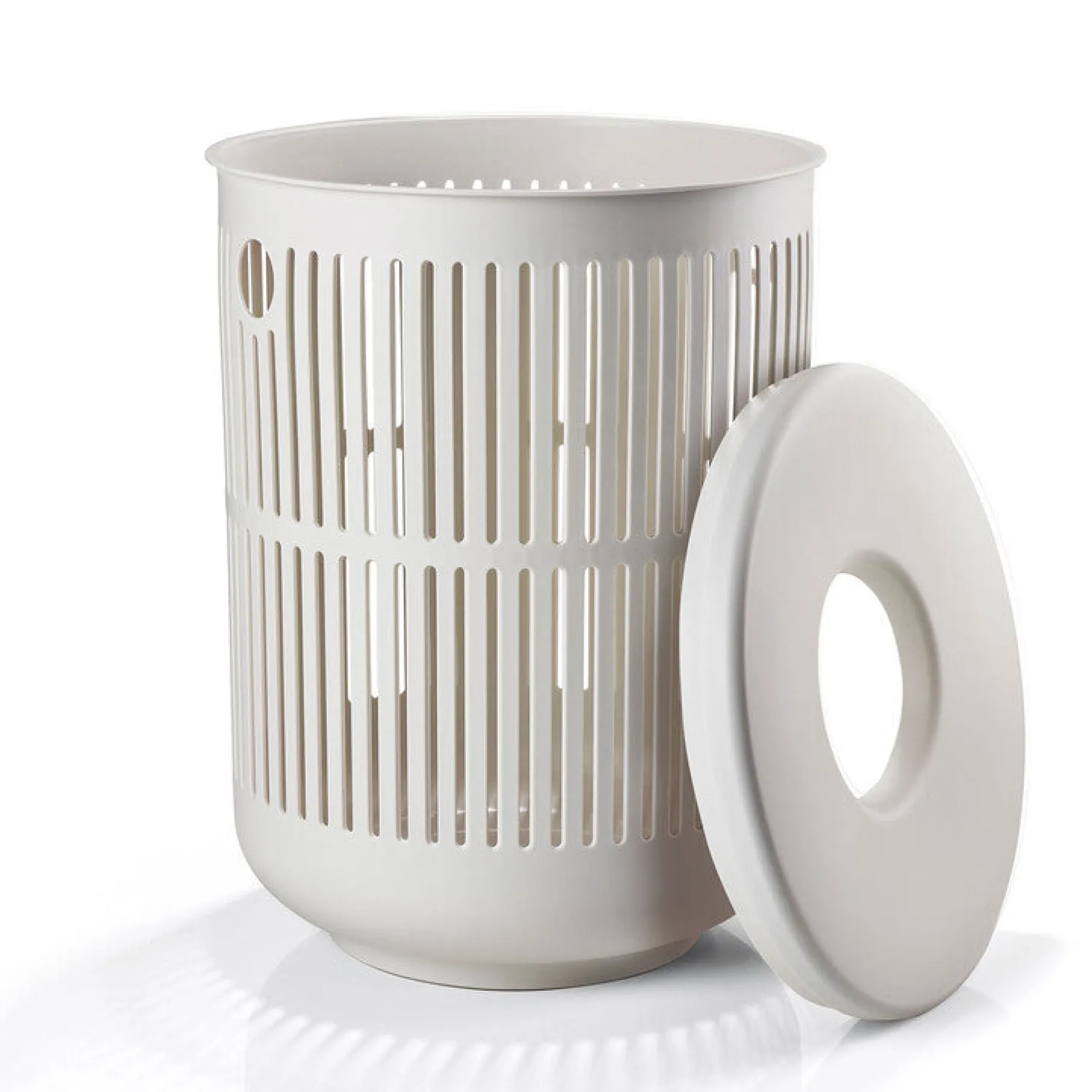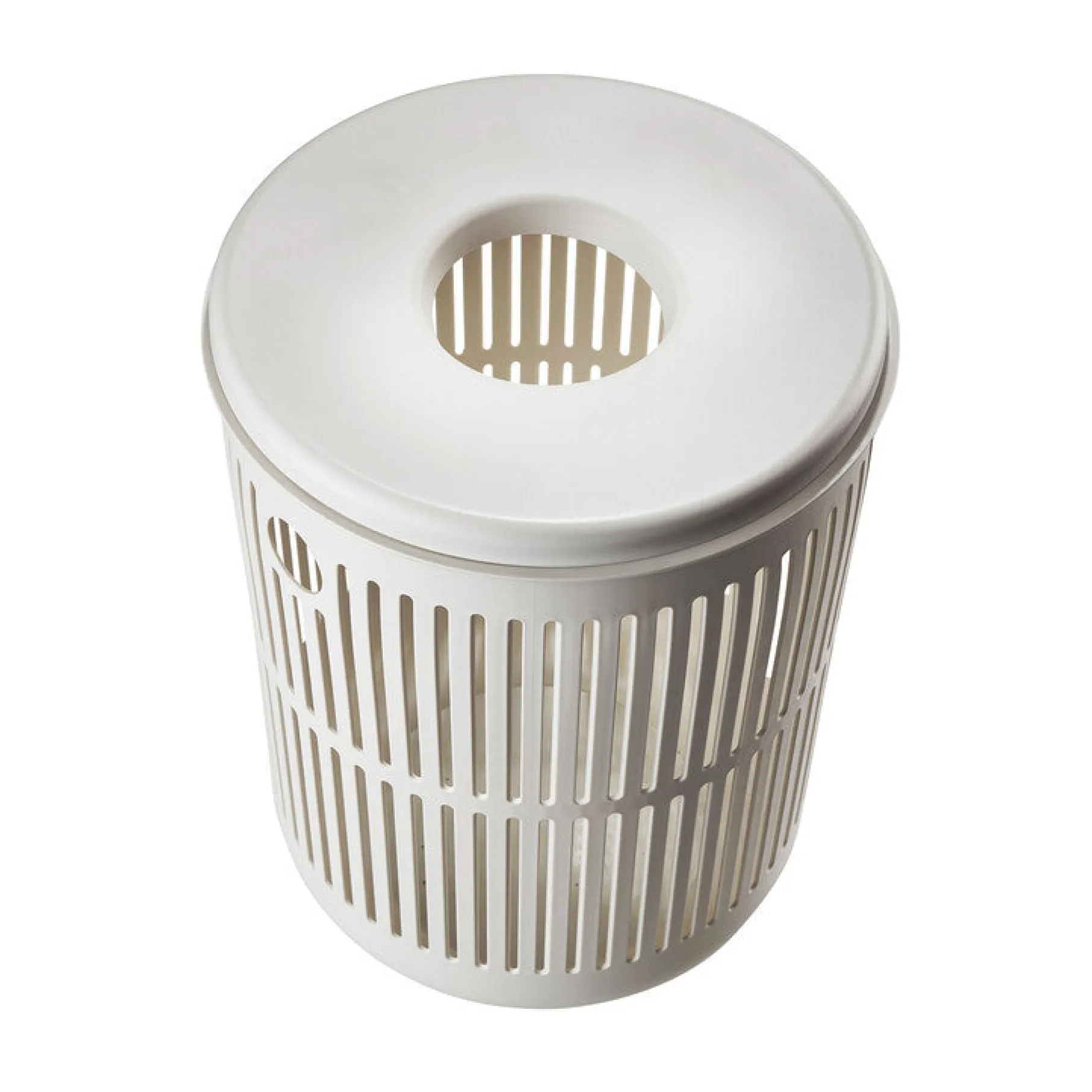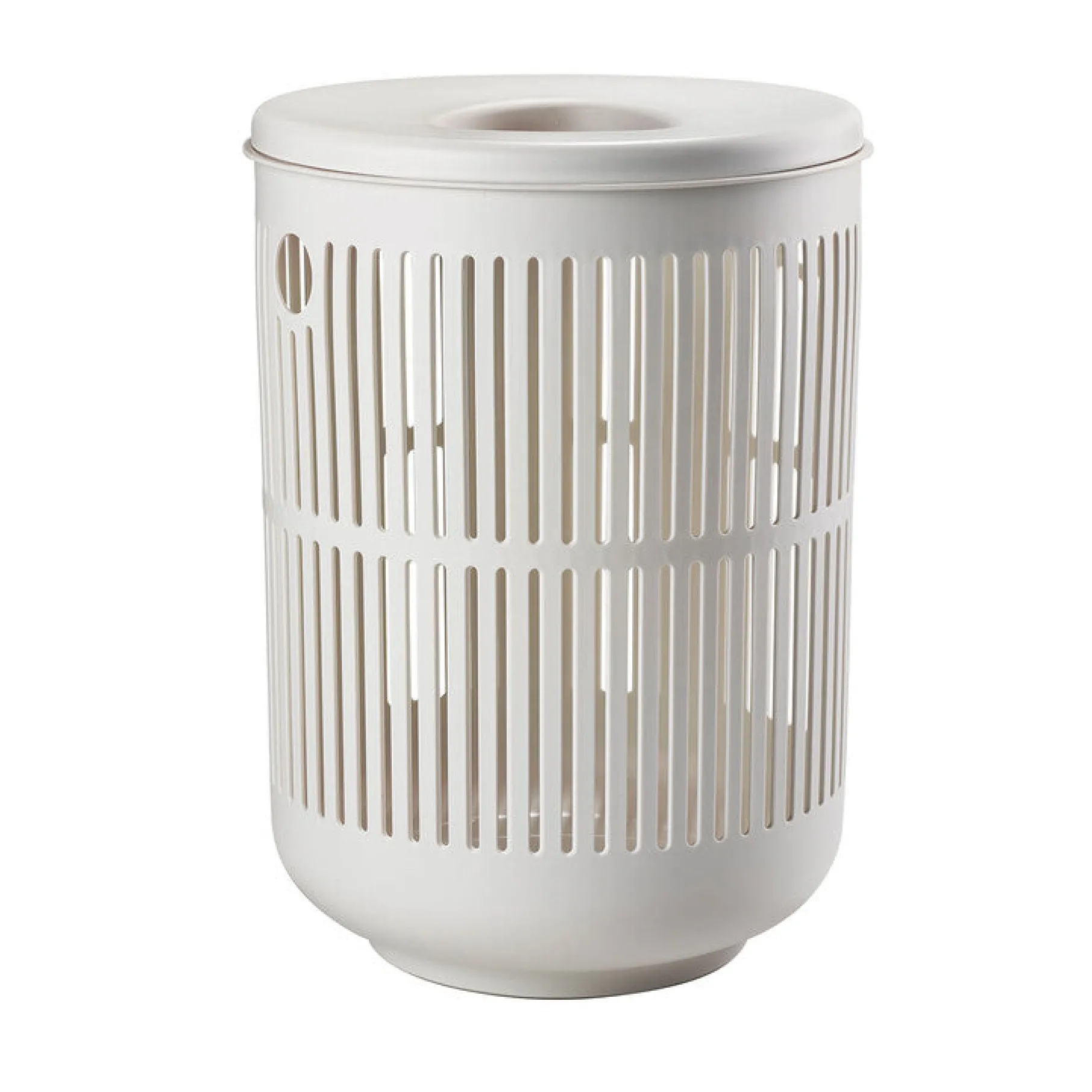 Vasketøjskurv, der er designet med funktionalitet for øje. Kurven har to håndtag i siderne, der gør det nemt at bære kurven, selv når den er fyldt med tøj. Med dens aftagelige låg og hul i midten kan du nemt smide mindre ting i kurven, såsom strømper og sokker, samtidig med at den bevarer sit stilrene design.